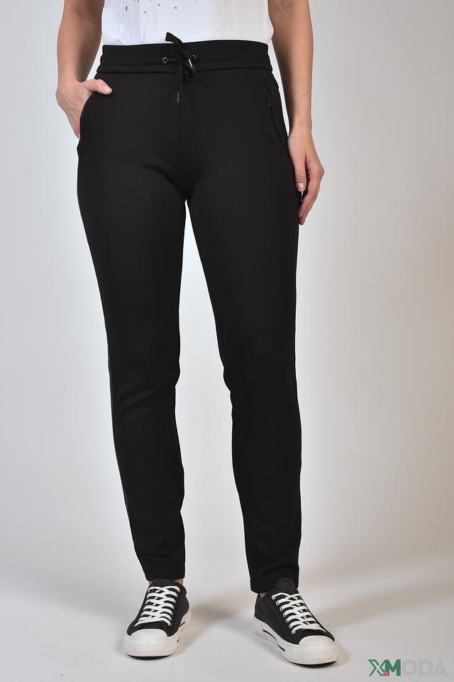 Брюки выполнены из качественного полиэстера с добавлением эластана, что обеспечивает комфортную посадку и свободу движений. Эластичный пояс дополнен шнурком для регулировки посадки. Модель имеет два боковых кармана и манжеты внизу штанин.