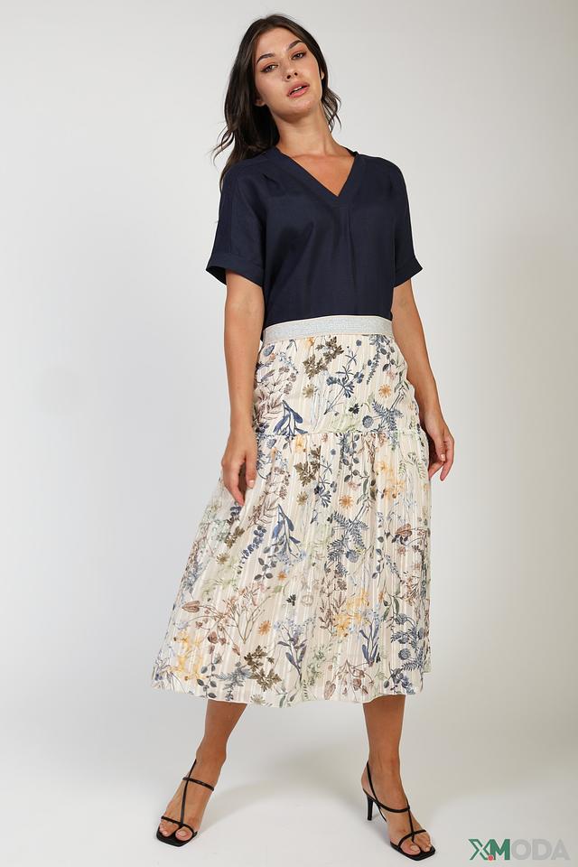 Юбка имеет плиссированный крой, который придает ей элегантность и динамичность. Яркий цветочный принт делает эту модель особенно привлекательной и подходящей для создания весенних и летних образов. Широкий пояс обеспечивает удобную посадку по фигуре.