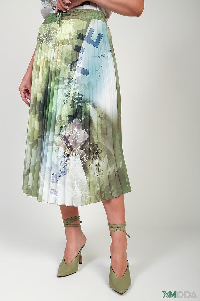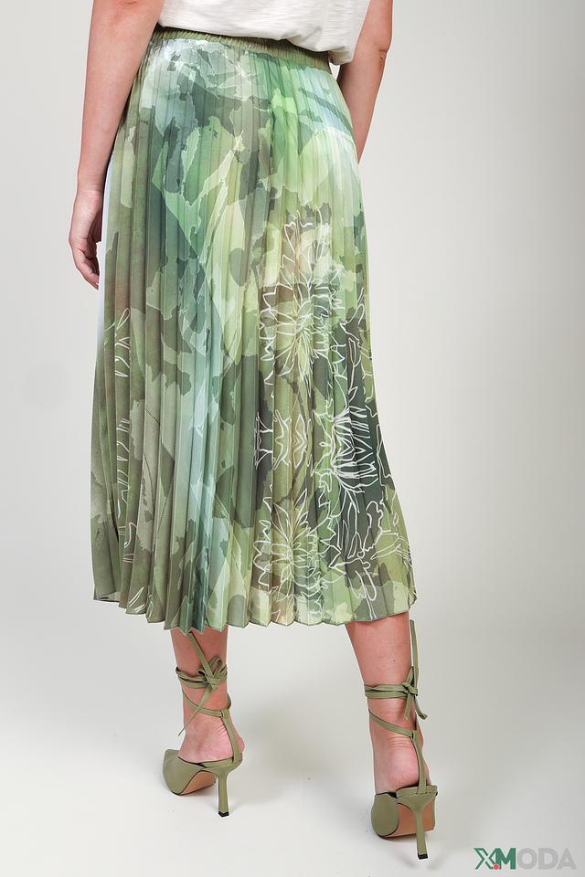 Юбка имеет классический крой плиссе, который визуально стройнит фигуру и добавляет динамики. Принт с абстрактными цветочными мотивами в зелёных и белых оттенках делает эту юбку уникальной и привлекательной.