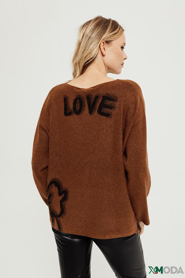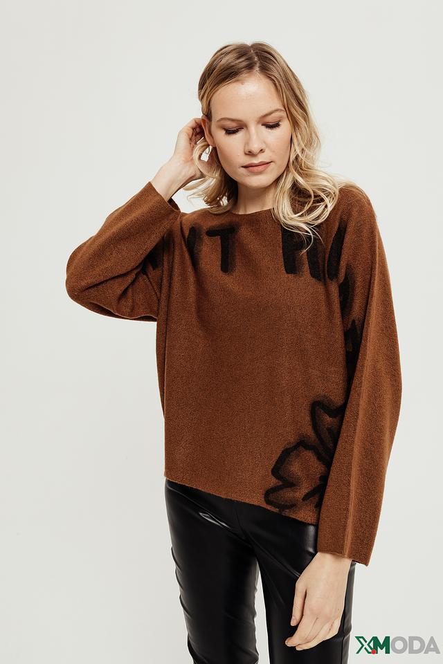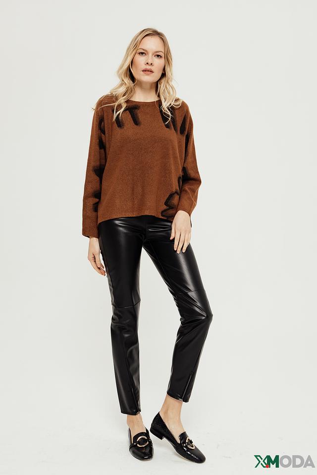 Основной цвет пуловера – коричневый. Он украшен принтом с абстрактными элементами в чёрном цвете, который добавляет изделию оригинальности и выразительности. Пуловер имеет свободный крой и округлый вырез горловины.