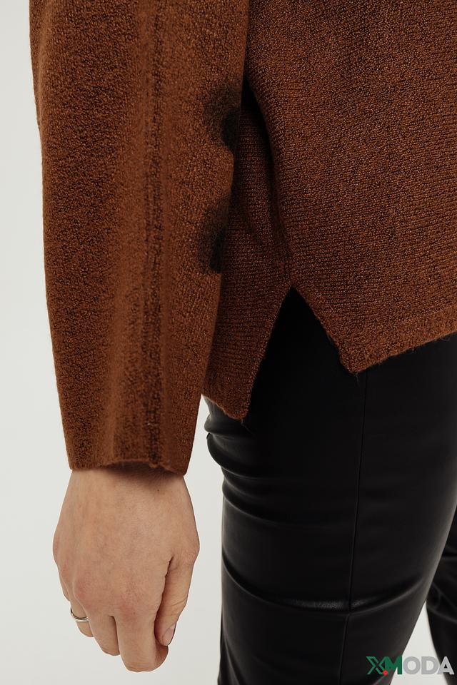Рукава пуловера длинные, слегка спущены. Низ изделия и рукава оформлены небольшими разрезами по бокам. Этот пуловер идеально сочетается с джинсами, брюками или юбками, создавая стильный и комфортный образ.