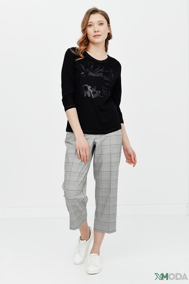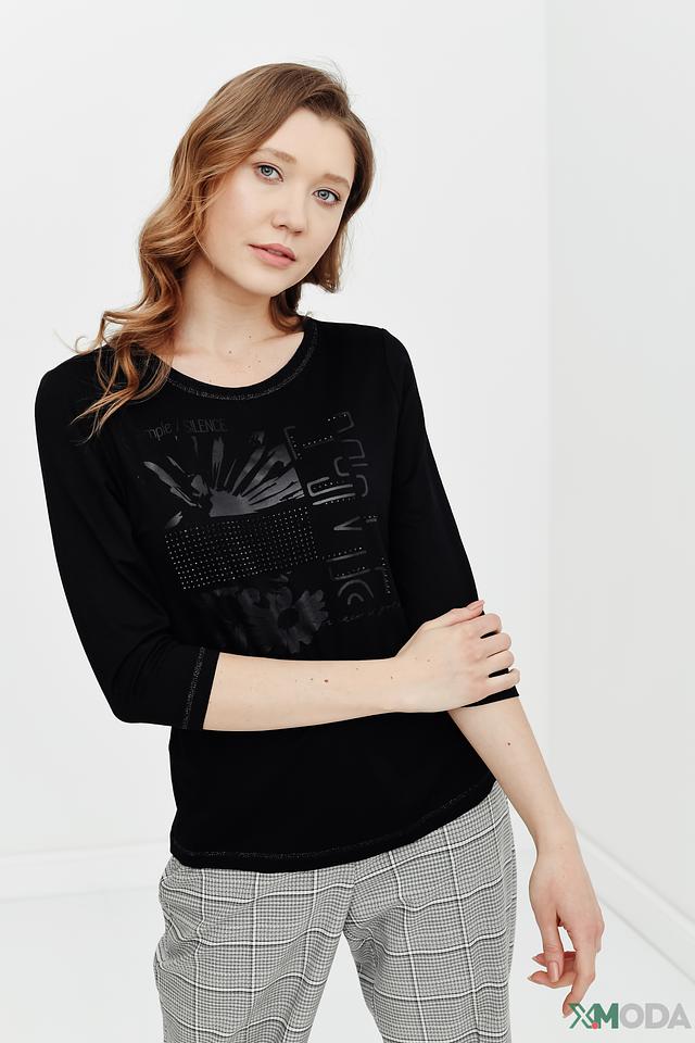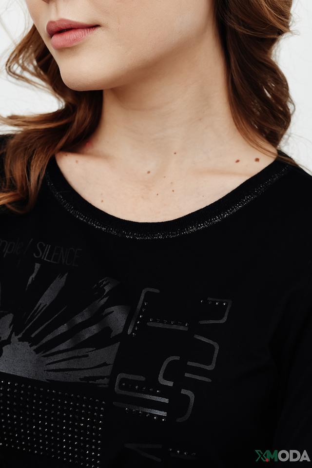 Блуза украшена эффектным принтом с изображением птицы и надписями, выполненными в сером цвете. Принт дополнен небольшими стразами, которые придают изделию изысканность и блеск. Вырез горловины – округлый, что обеспечивает комфортную посадку.