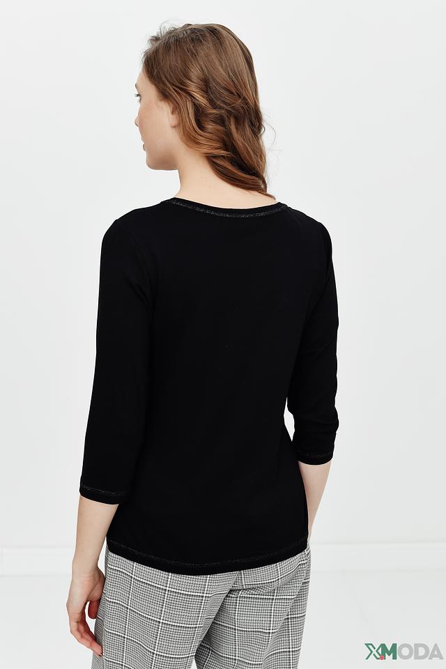 Чёрная блуза Lecomte с оригинальным принтом и рукавами 3/4 станет стильным дополнением к вашему гардеробу. Изготовлена из мягкой вискозы с добавлением эластана для комфорта и удобства. Состав: вискоза 92%, эластан 8%