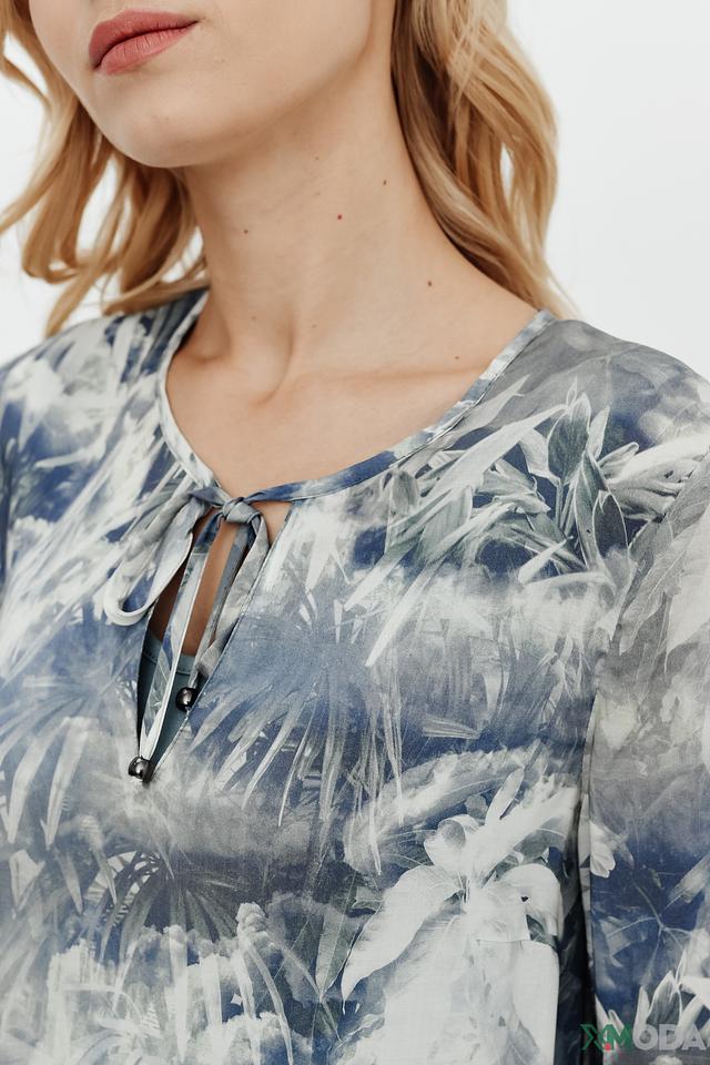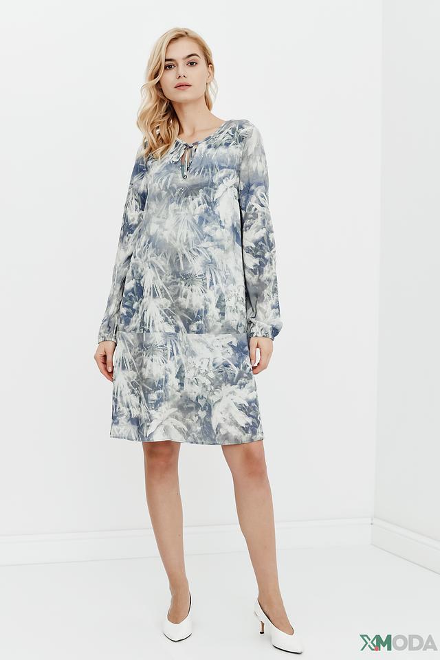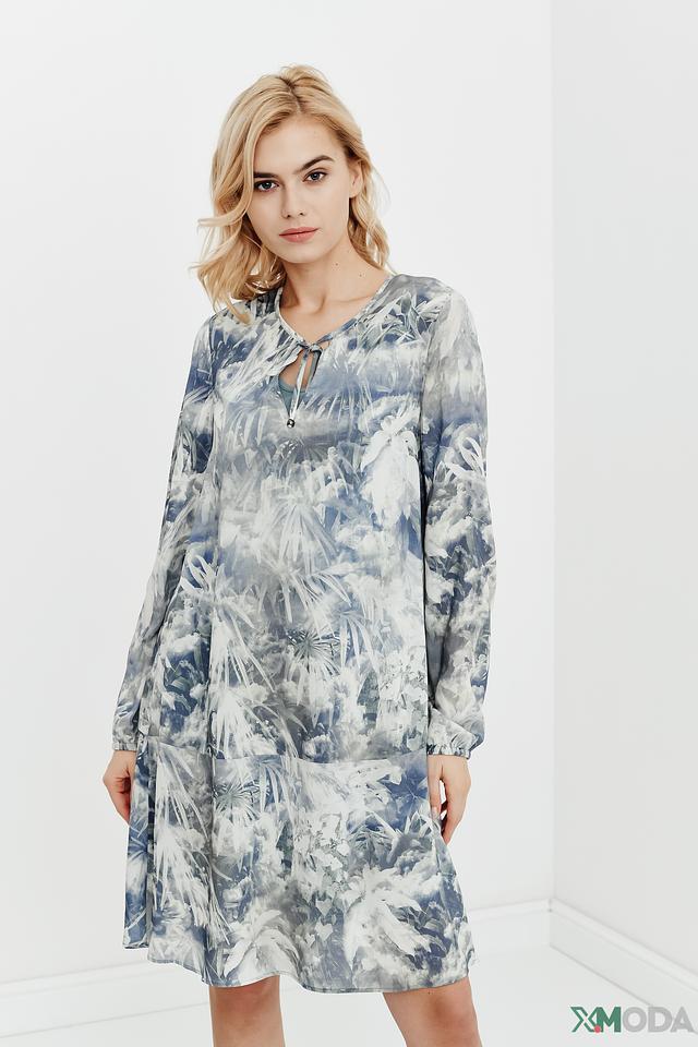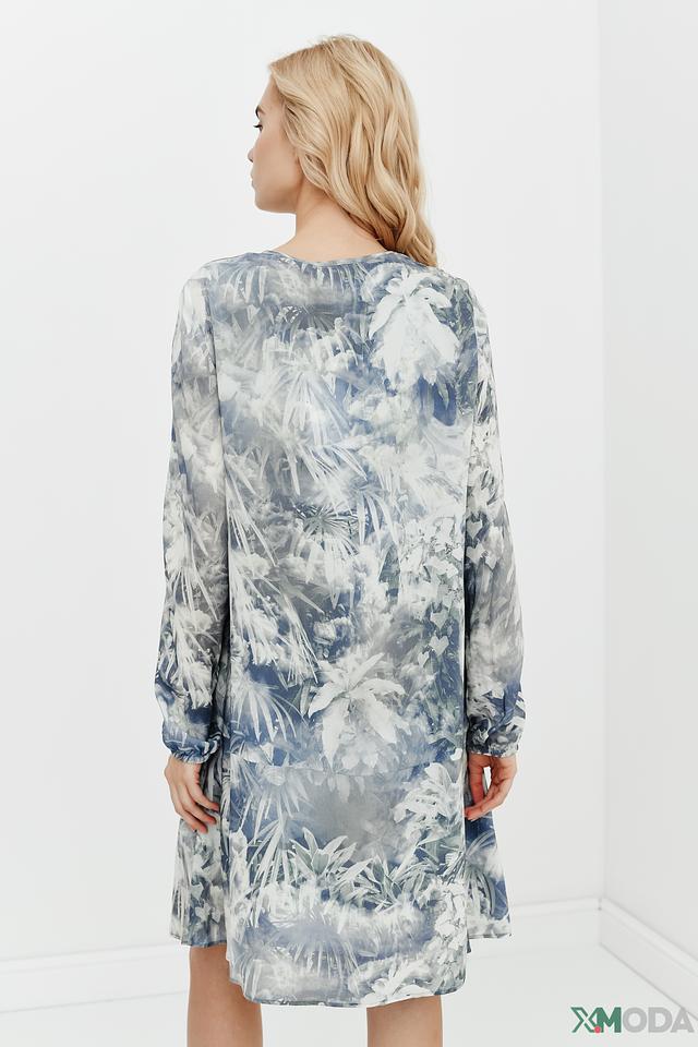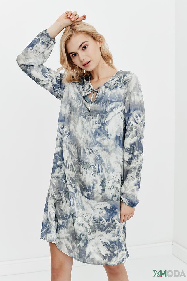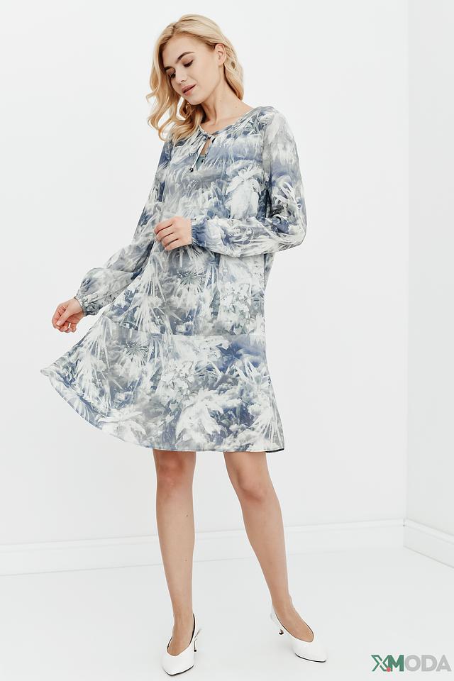 Платье имеет свободный крой, который не сковывает движений и подходит для разных типов фигур. Длинные рукава и V-образный вырез с небольшим разрезом добавляют образу женственности и изящества. Привлекательный цветочный принт в голубых и белых тонах делает это платье особенно привлекательным.