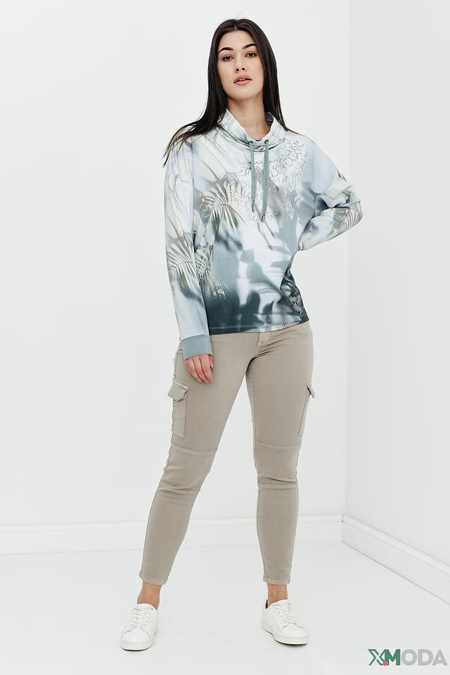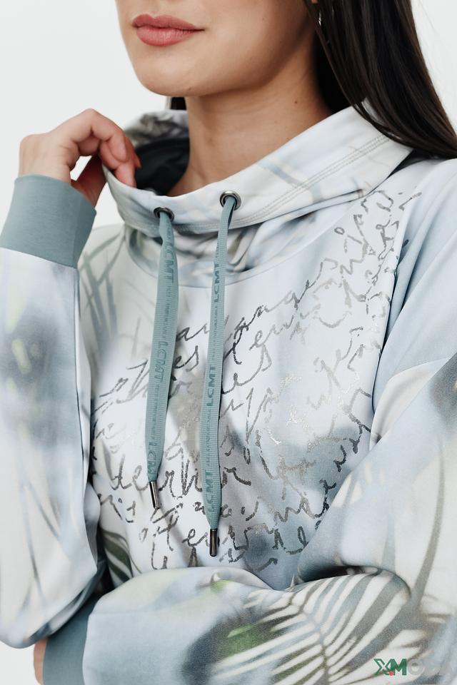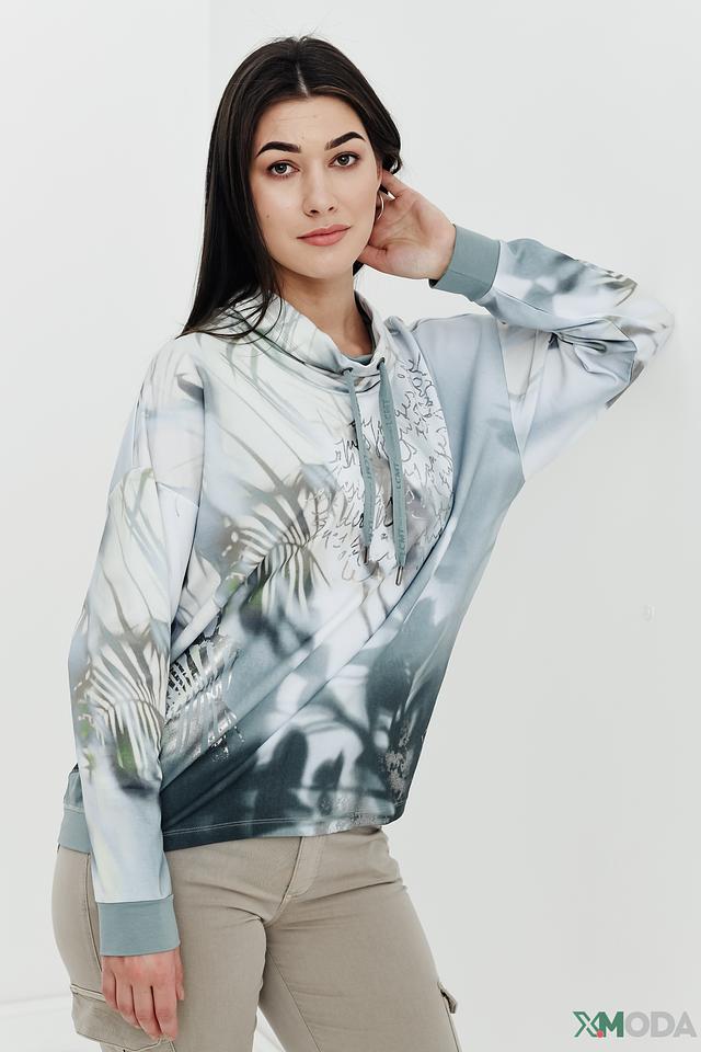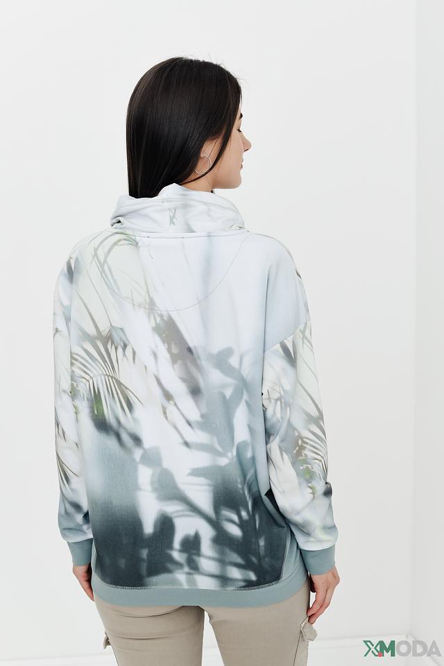 Пуловер имеет свободный крой и удобный капюшон с регулируемыми шнурками. Особенностью модели является яркий и необычный принт, сочетающий в себе абстрактные узоры и изображение листьев. Цветовая гамма пуловера включает в себя оттенки светло-серого, голубого и белого, создавая свежий и современный образ.