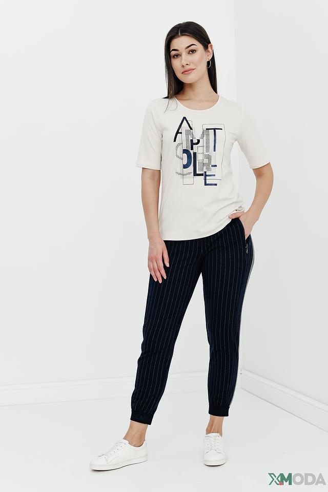 Брюки имеют удобный эластичный пояс, дополненный функциональной кулиской для регулировки посадки. По бокам расположены декоративные полосы, добавляющие динамики образу. Крой брюк – зауженный к низу, что создает аккуратный силуэт.