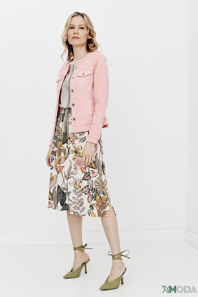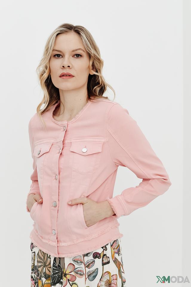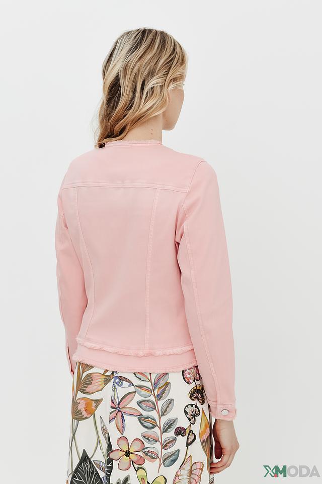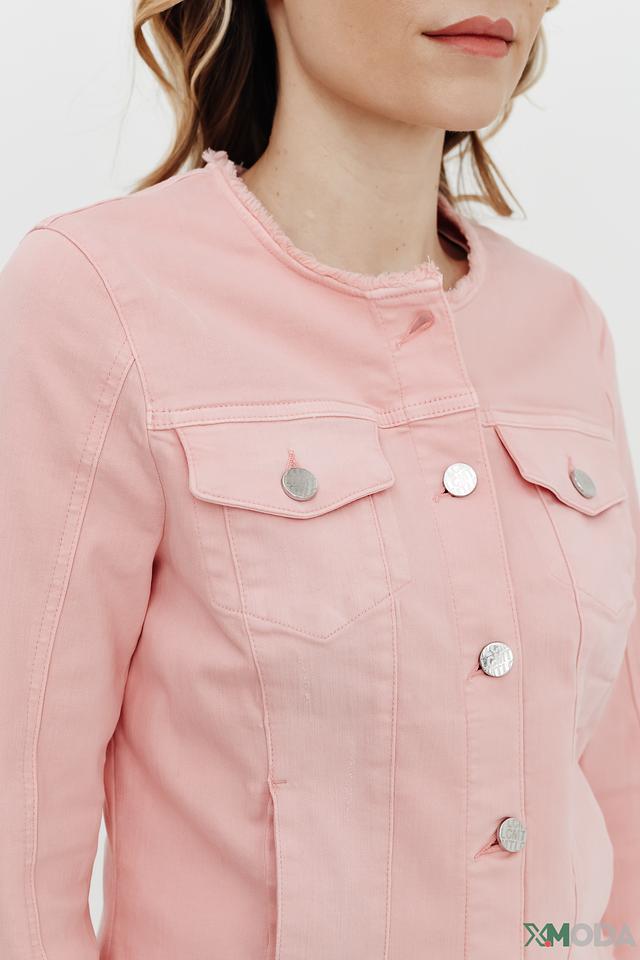 Жакет имеет округлый вырез горловины и короткие рукава. Модель дополнена функциональными карманами. Текстура ткани напоминает деним, но более мягкая и приятная на ощупь.