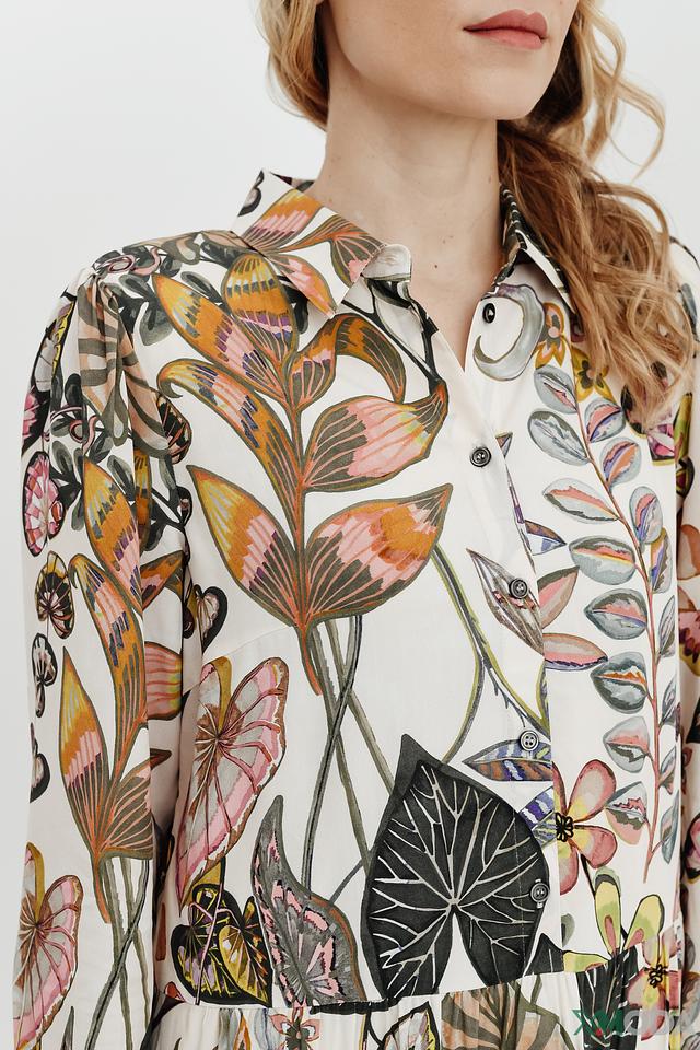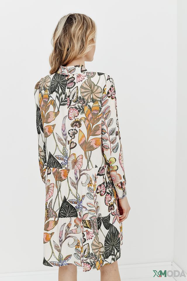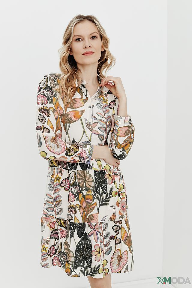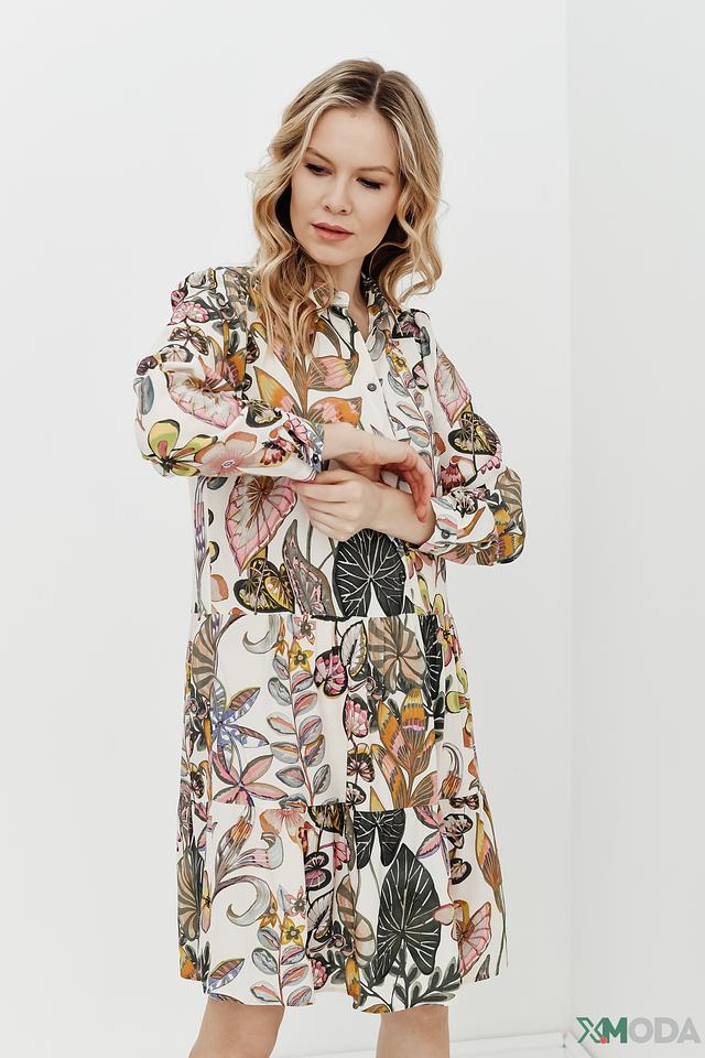 Платье имеет прямой силуэт, длину чуть выше колена и длинные рукава. Застежка выполнена на пуговицах по всей длине платья, что позволяет регулировать степень открытости. Яркий цветочный принт добавляет образу женственности и легкости.