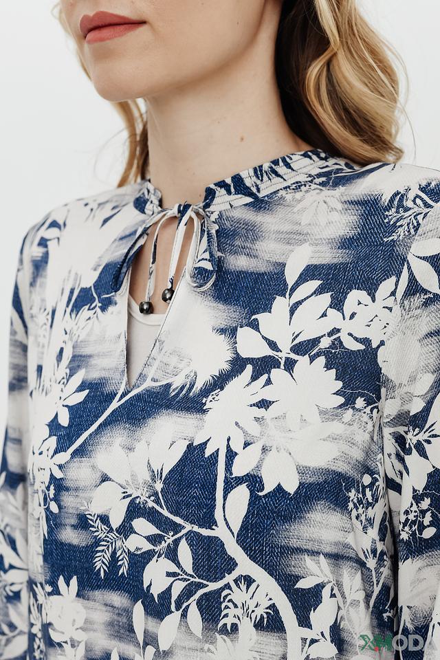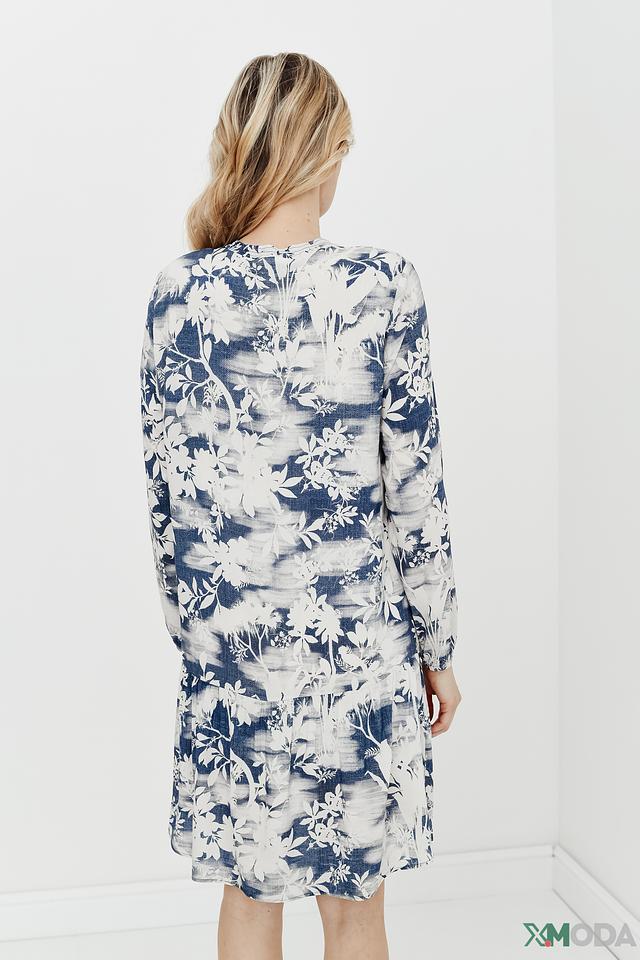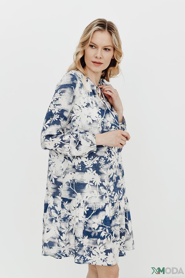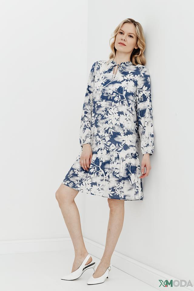 Основной цвет платья – синий, но оно украшено ярким цветочным принтом в белых и кремовых тонах. Этот принт добавляет платью женственности и романтичности. Платье идеально подходит для повседневной носки, а также для особых случаев.