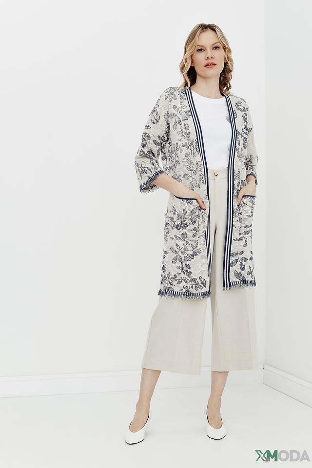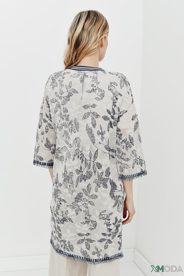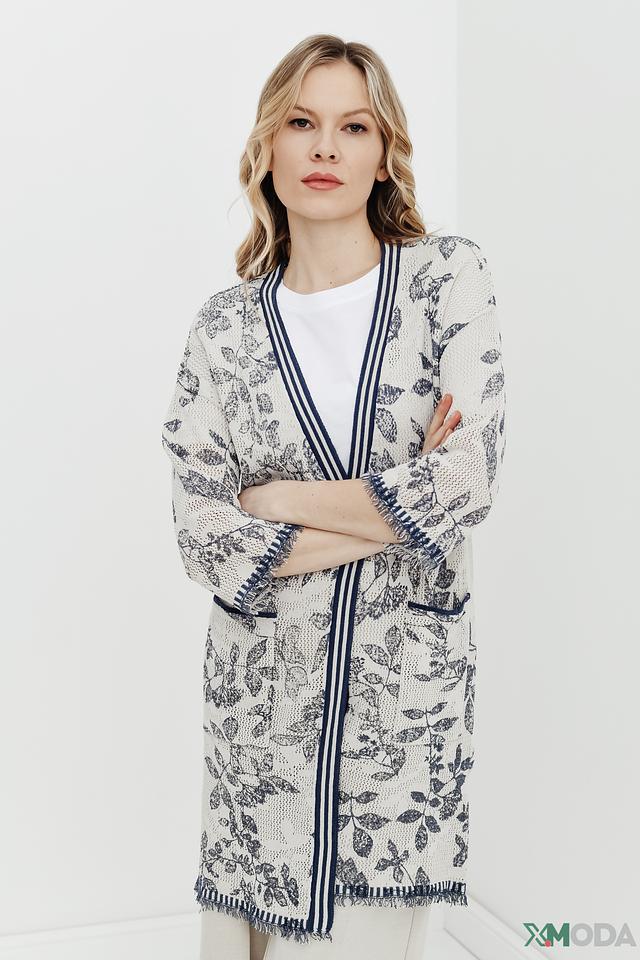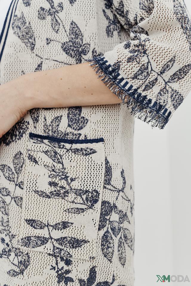 Модель имеет свободный крой, что обеспечивает свободу движений и комфорт в носке. Отделка по краям и на рукавах выполнена в насыщенном синем цвете, что создает контрастный и стильный акцент. Жакет застегивается на скрытые пуговицы.