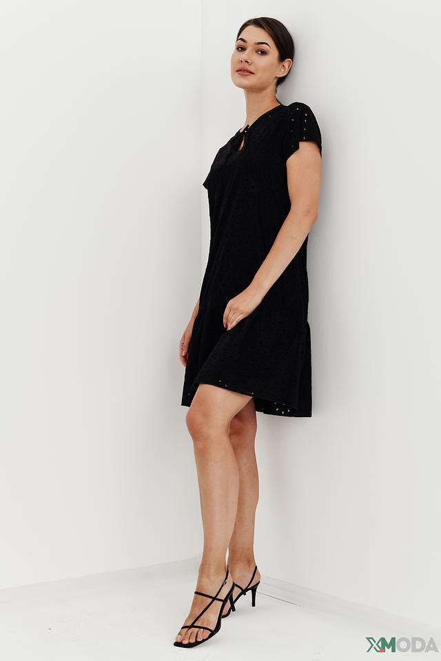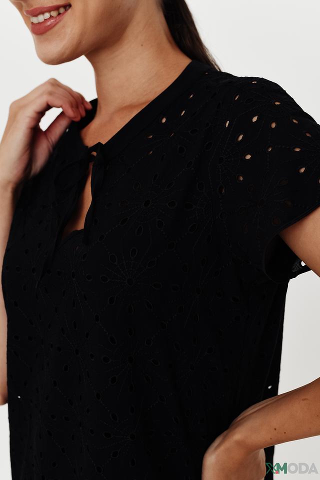 Модель имеет прямой силуэт, короткие рукава и круглый вырез горловины, который дополнен небольшим вырезом с завязками. Платье полностью покрыто ажурной вышивкой, придающей ему изысканность и неповторимость.