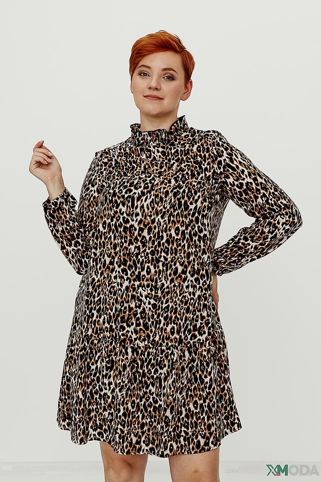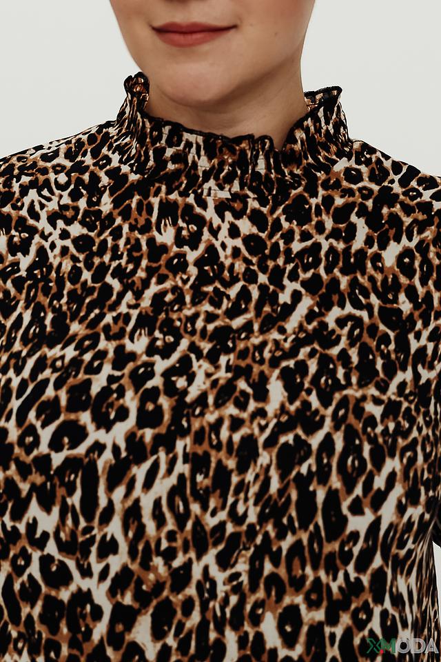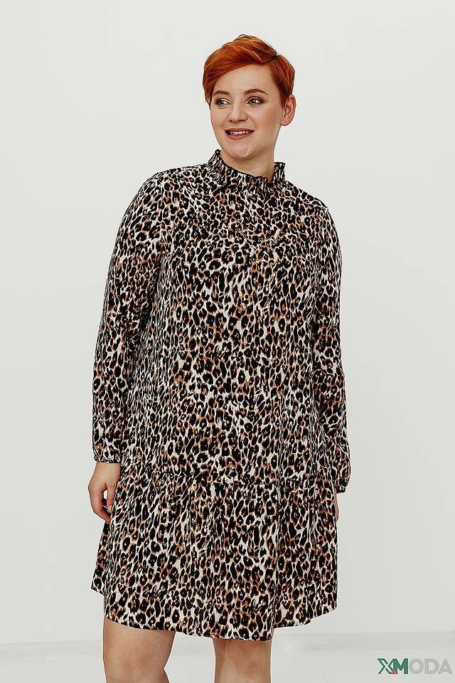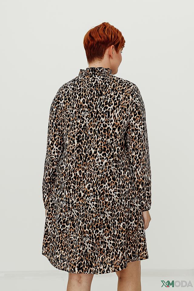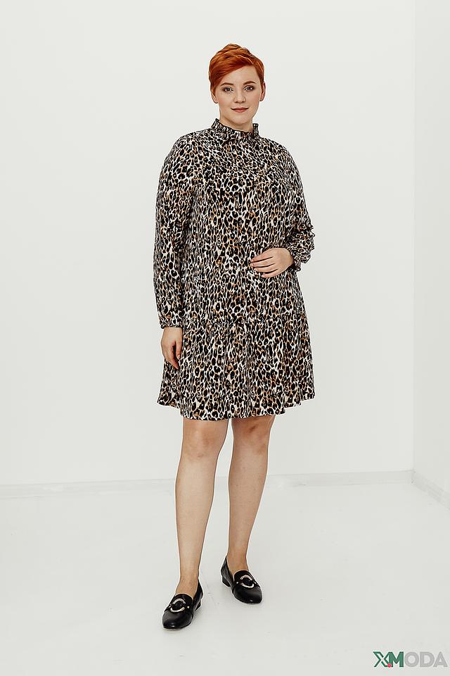 Платье имеет яркий леопардовый принт, который придаёт ему оригинальность и выразительность. Длинные рукава и удобный крой делают его идеальным для повседневной носки. Высокий воротник-стойка добавляет элегантности образу.