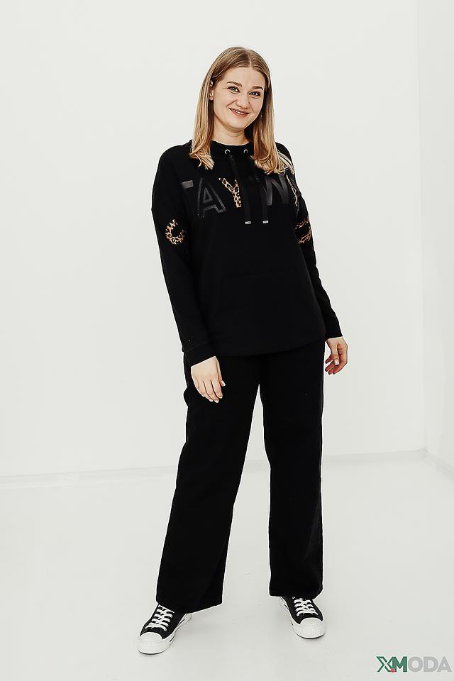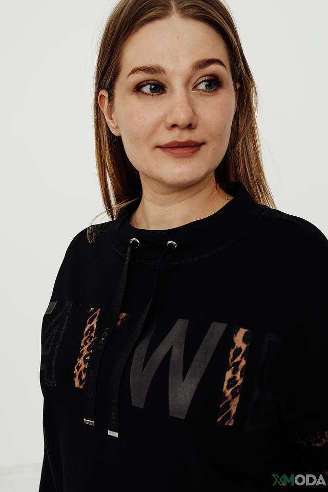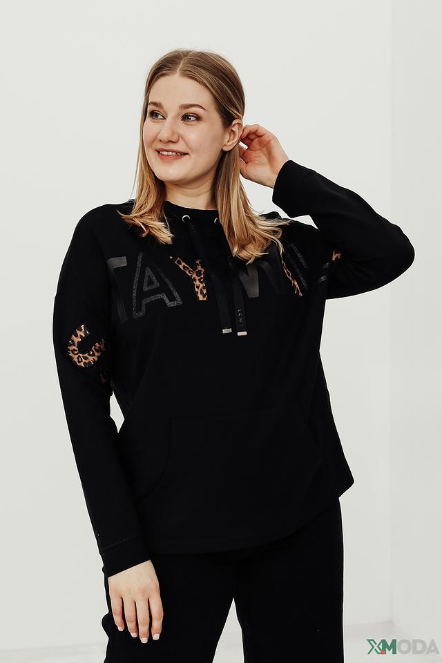 Пуловер имеет свободный крой, длинные рукава и капюшон. Передняя часть украшена ярким принтом с леопардовыми элементами и надписью. Такой дизайн добавит образу индивидуальности и стиля.