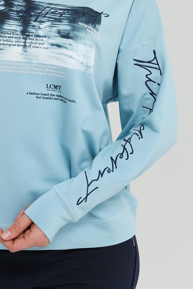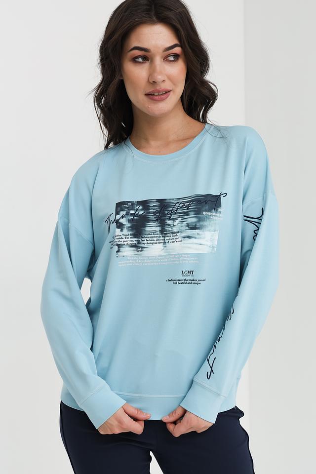 Женская толстовка Lecomte голубого цвета с оригинальным принтом на лицевой стороне. Изготовлена из мягкого и приятного к телу сочетания хлопка и модала, обеспечивающего комфорт при носке. Стильный и удобный вариант для повседневного образа. Состав: хлопок 48%, модал 48%, эластан 4%