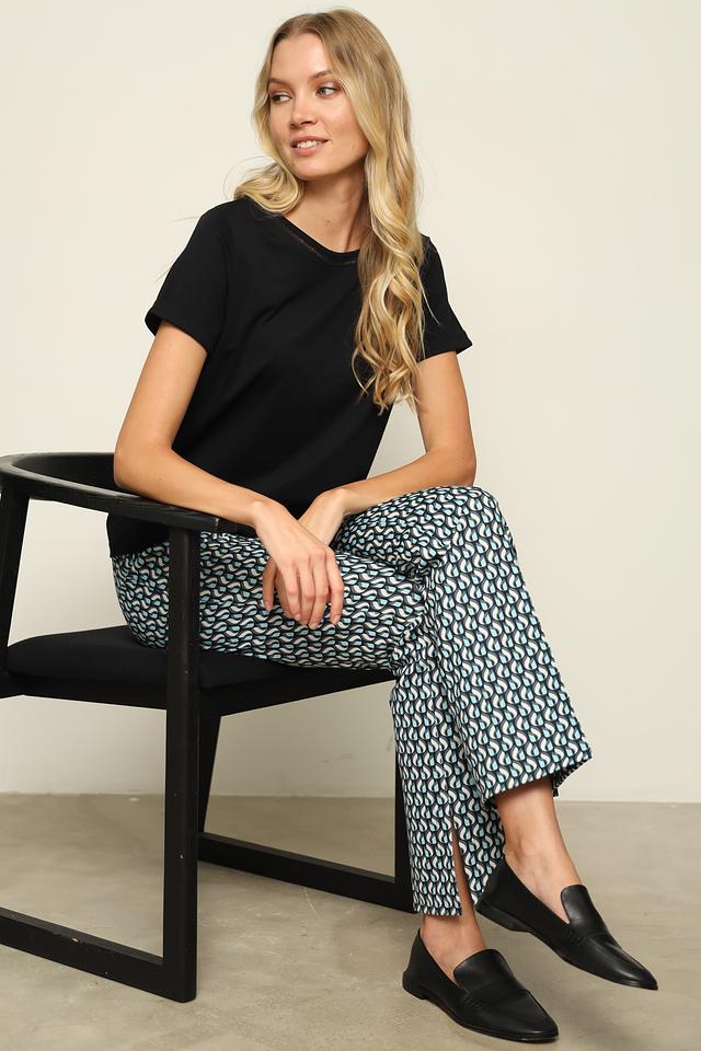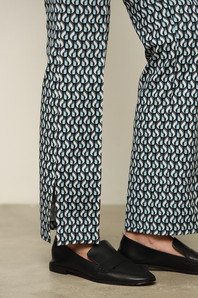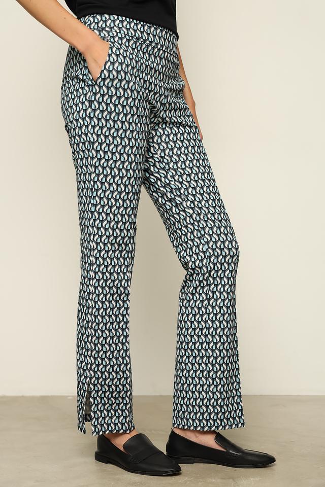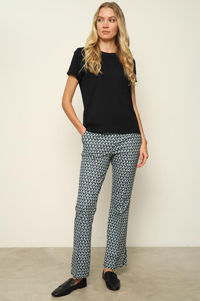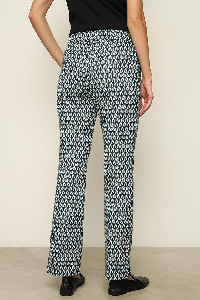 Женские брюки Lecomte синего цвета с оригинальным геометрическим принтом станут стильным дополнением к вашему гардеробу. Модель выполнена из приятной к телу ткани с добавлением эластана для комфортной посадки. Состав: полиэстер 65%, хлопок 30%, эластан 5%
