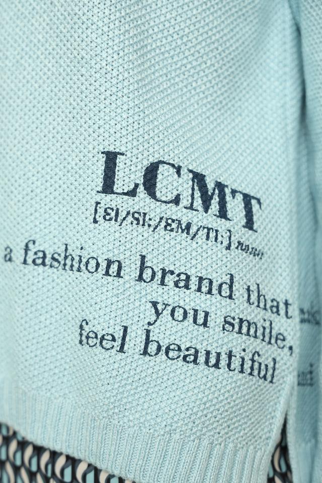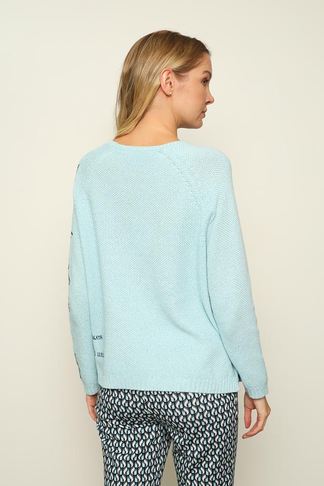 Особенностью модели является оригинальный принт с надписями и графическими элементами, который добавляет образу индивидуальности. Пуловер имеет классический крой с длинными рукавами и круглым вырезом горловины.