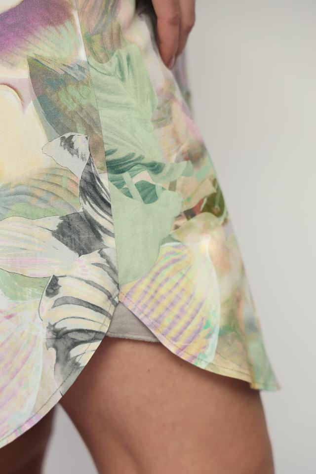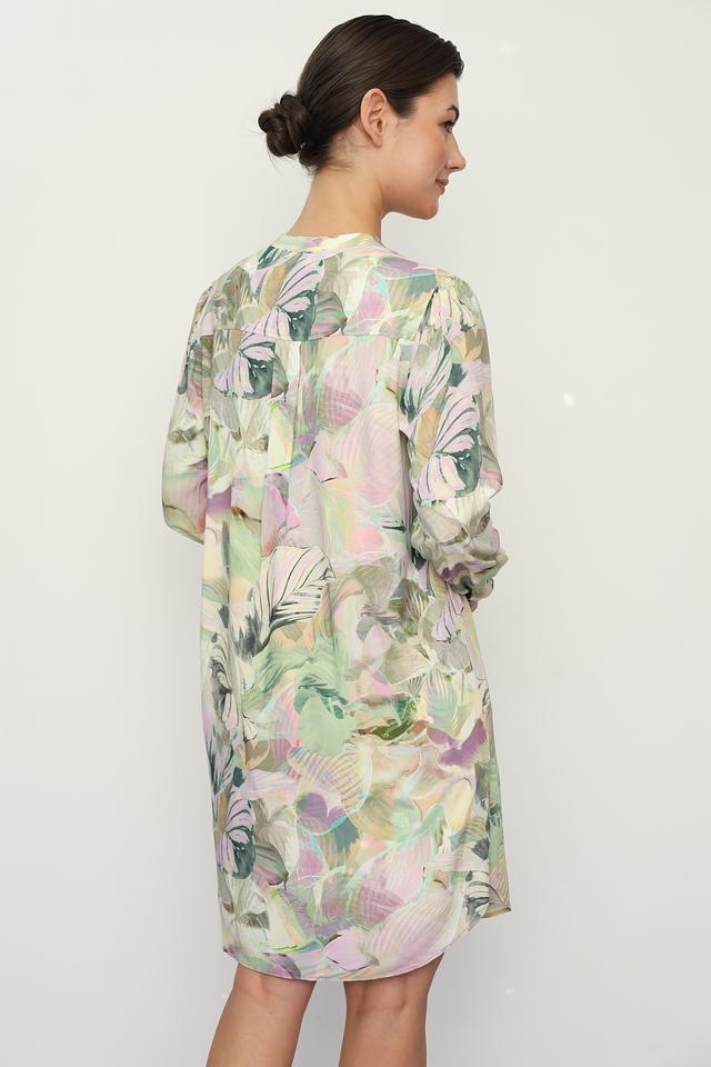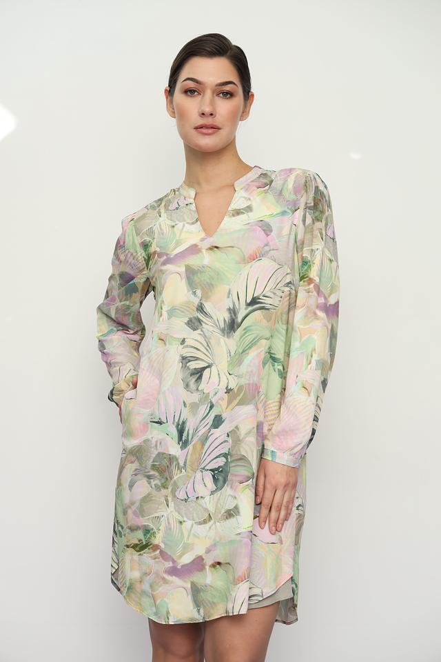 Это платье от Lecomte – идеальный выбор для тех, кто ценит комфорт и стиль. Выполнено в светло-зелёной цветовой гамме и украшено ярким, красочным цветочным принтом, что делает его особенно привлекательным.