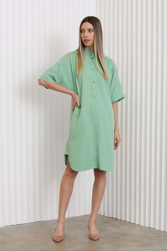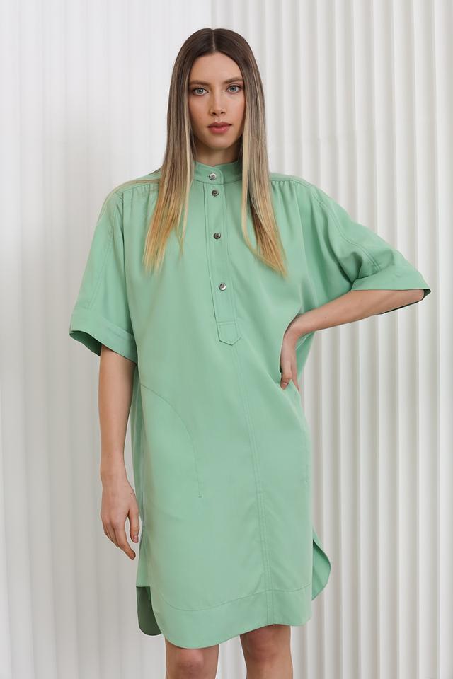 Платье имеет прямой, слегка свободный крой, который не сковывает движений и подходит для разных типов фигур. Отличительной особенностью модели является воротник-стойка с застежкой на пуговицы и короткие рукава с манжетами, которые можно зафиксировать.