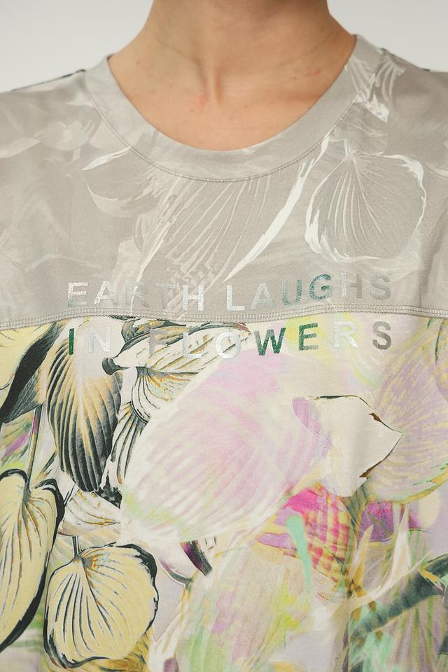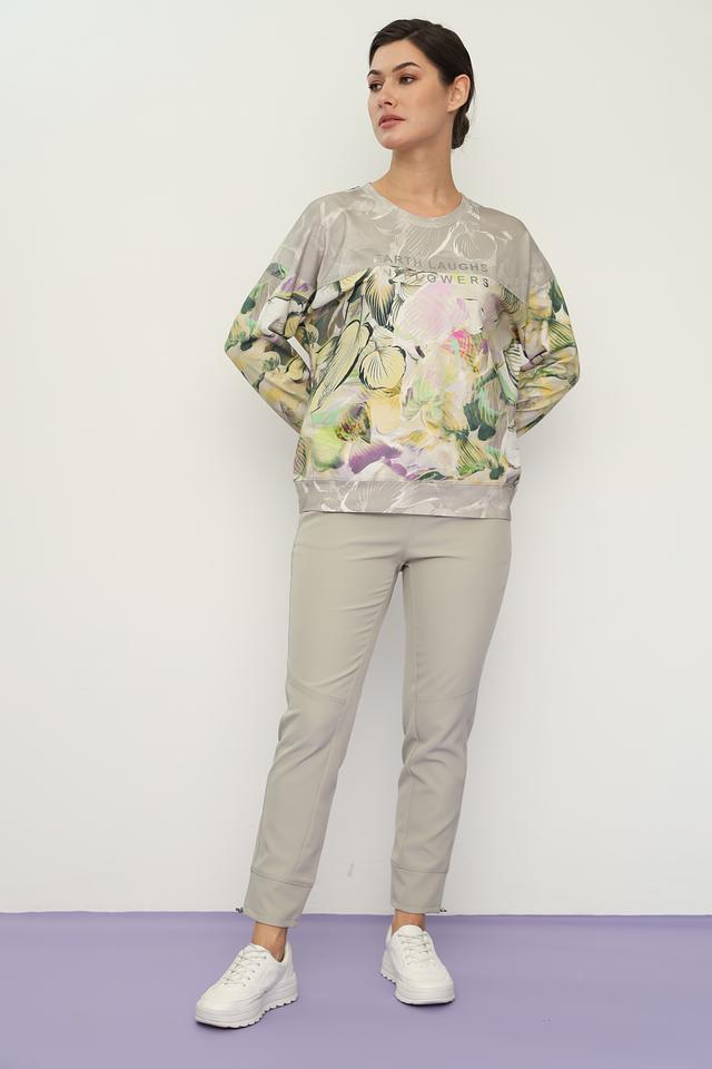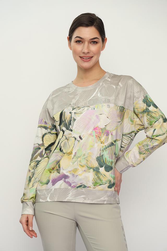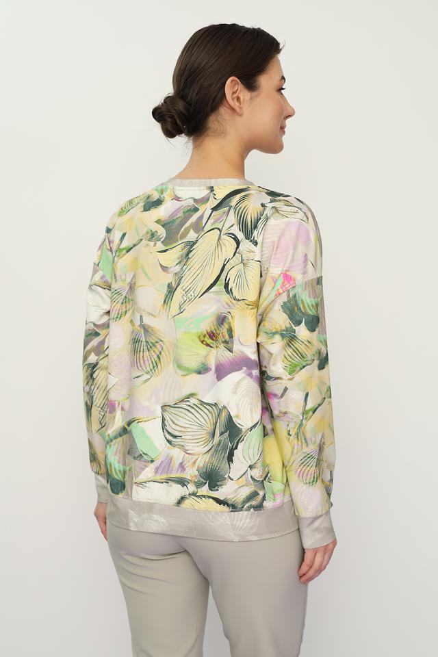 Пуловер имеет свободный крой и круглый вырез горловины. Главная особенность модели – яркий и красочный цветочный принт, который добавляет образу легкости и свежести. Принт выполнен в пастельных тонах с преобладанием зелёного, жёлтого и розового цветов.
