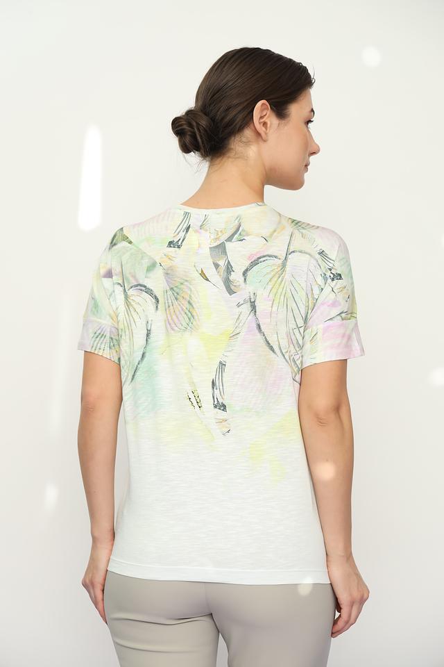 Женская футболка Lecomte светло-зелёного цвета с ярким цветочным принтом. Модель выполнена из мягкого и приятного к телу сочетания хлопка и модала, обеспечивая комфорт в носке. Состав: хлопок 50%, модал 50%