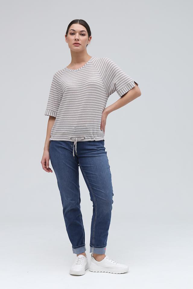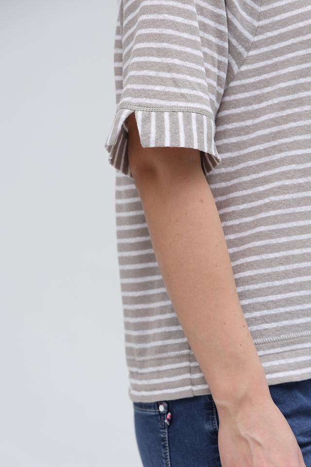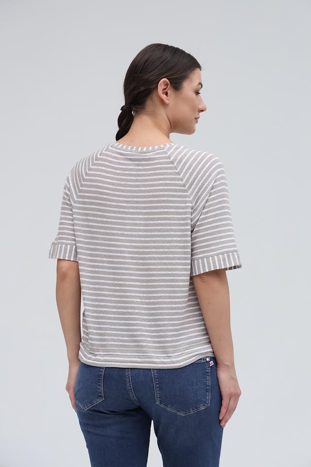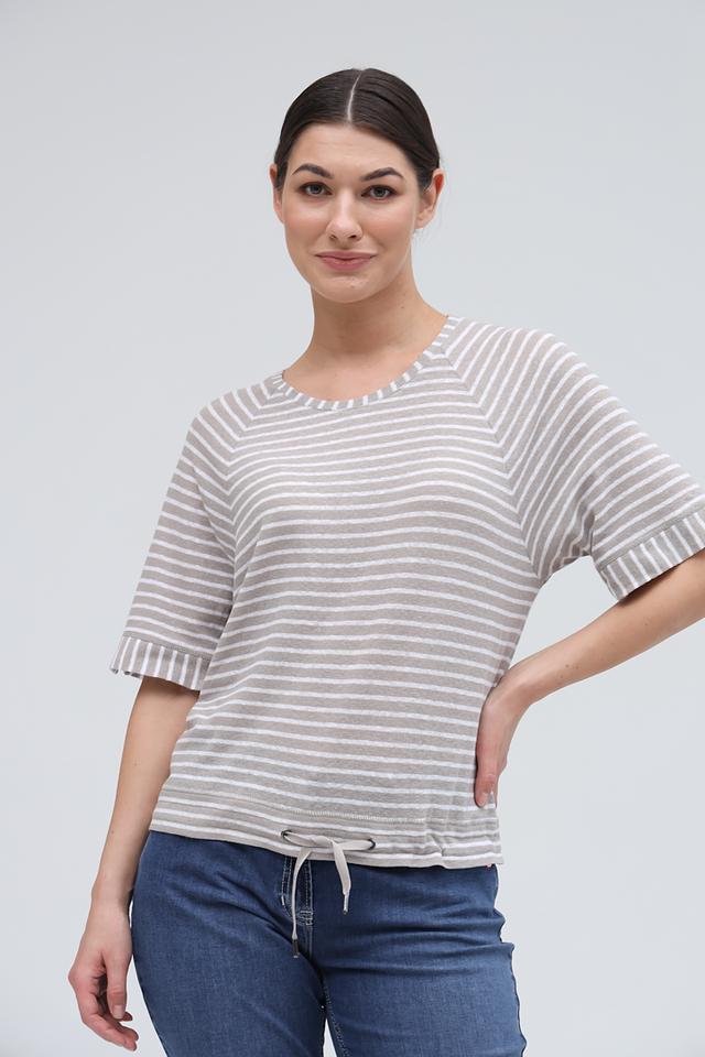 Женский пуловер Lecomte бежевого цвета в полоску с коротким рукавом и завязками по бокам. Изготовлен из натурального хлопка с добавлением льна и эластана для комфорта и удобства. Состав: хлопок 65%, лен 30%, эластан 5%