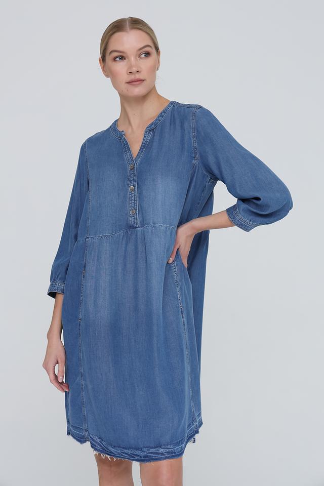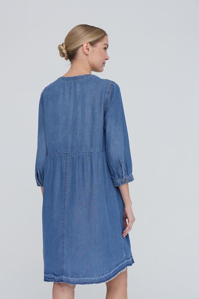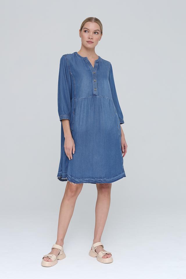 Джинсовое платье Lecomte голубого цвета – это стильное и комфортное решение для повседневного образа. Платье имеет свободный крой, рукава 3/4 и V-образный вырез. Изготовлено из 100% лиоцела. Состав: лиоцел 100%