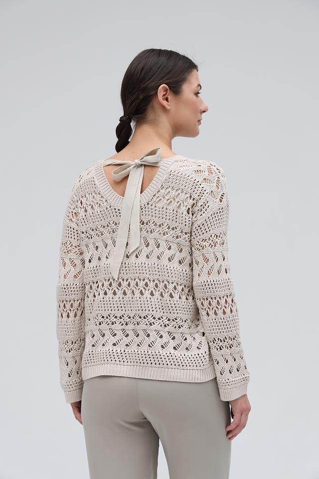 Сзади пуловер дополнен двумя тонкими завязками, которые можно завязать бантиком или оставить свободно свисающими, создавая дополнительный акцент. Этот пуловер идеально подойдет для создания повседневных образов, а также для особых случаев.