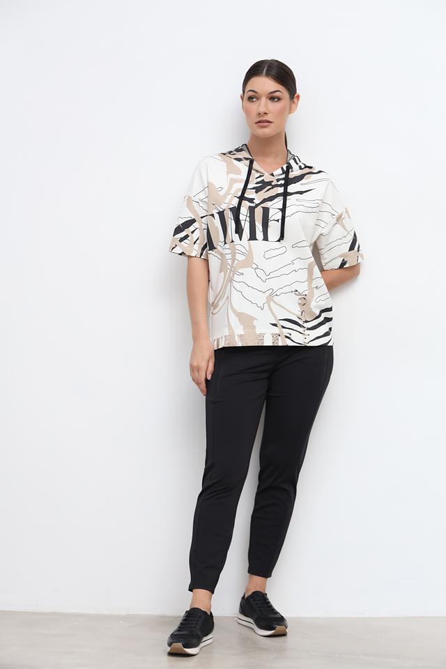 Женская футболка Lecomte бежевого цвета с оригинальным абстрактным принтом. Модель с коротким рукавом и капюшоном, выполненная из мягкого и приятного к телу трикотажа. Состав: хлопок 60%, вискоза 35%, эластан 5%
