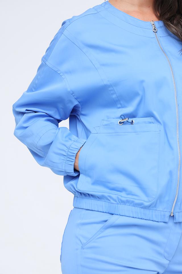 Жакет имеет приталенный силуэт, который подчеркивает фигуру, и застегивается на молнию. Два нагрудных кармана с клапанами добавляют функциональности и стиля. Эластичные манжеты обеспечивают комфортную посадку и предотвращают выбивание рукавов.