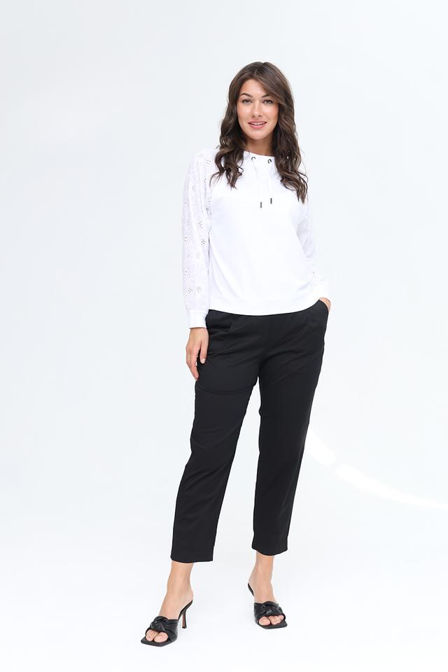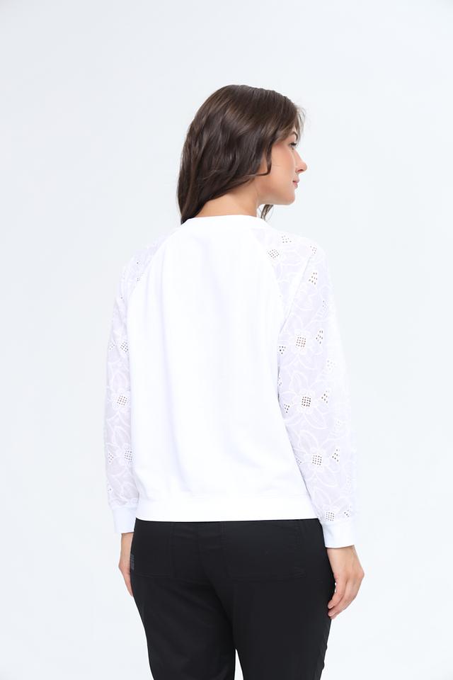 Блуза имеет длинный рукав, украшенный изысканной вышивкой, что придает ей особый шарм и элегантность. Вырез горловины оформлен небольшим разрезом и завязками, добавляя модели женственности.