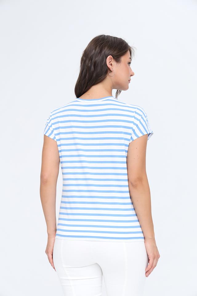 Завершает образ контрастная полоска на рукавах и по низу изделия в бело-голубую полоску. Эта деталь придает футболке дополнительный шарм и оригинальность. Футболка Lecomte идеально сочетается с джинсами, шортами или юбками, позволяя создавать разнообразные стильные комплекты.