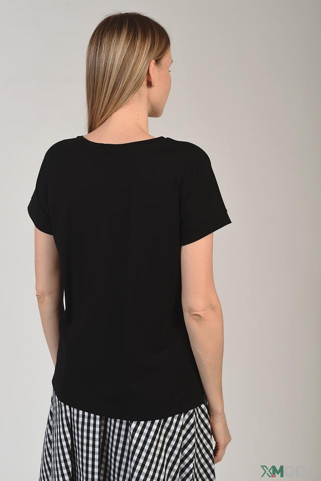 Модель имеет прямой крой, короткие рукава и круглый вырез горловины, что обеспечивает комфортную посадку по фигуре. Футболка изготовлена из высококачественной вискозы (61%) и нейлона (39%), сочетающих в себе мягкость, лёгкость и долговечность.
