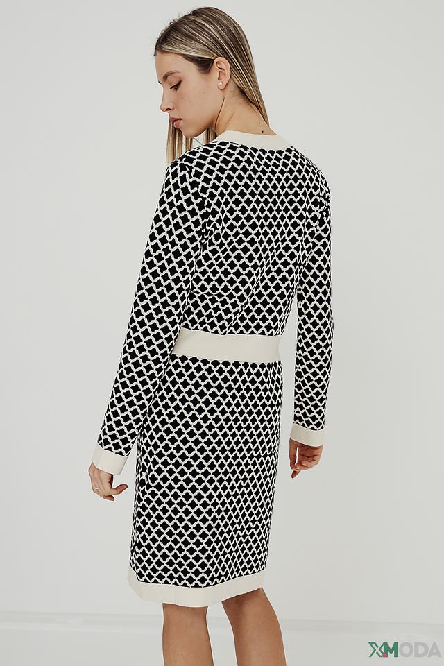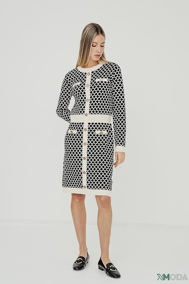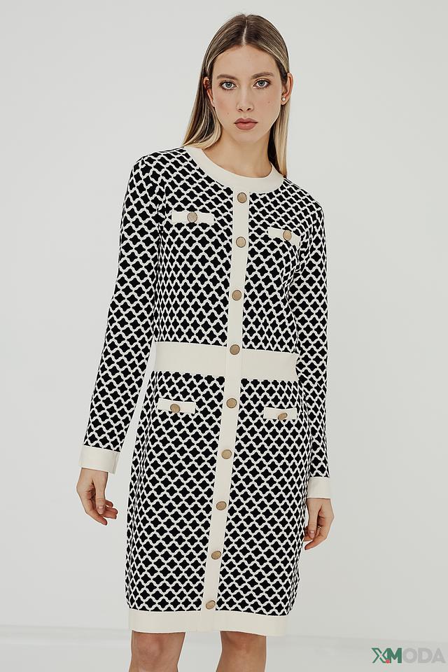 Стильное платье Leo & Ugo чёрно-белого цвета с геометрическим узором "ромб" и длинными рукавами. Приталенный силуэт и декор в виде пуговиц придают модели элегантный вид. Состав: вискоза 50%, полиэстер 28%, нейлон 22%