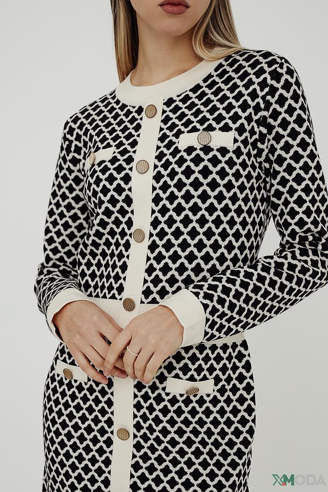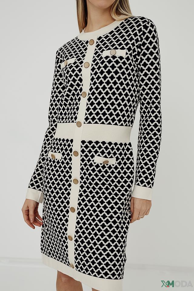 Платье выполнено из мягкого трикотажа, в состав которого входит вискоза, полиэстер и нейлон. Декоративные элементы в виде пуговиц добавляют изысканности образу. Узор "ромб" создает интересный визуальный эффект.