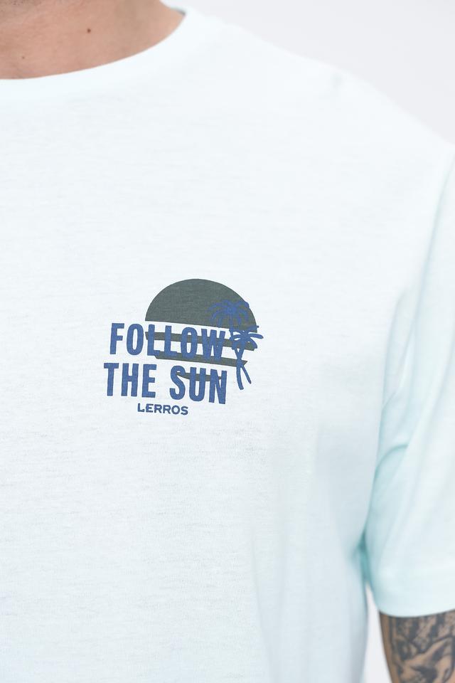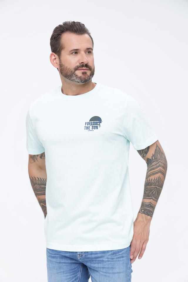 Футболка имеет классический прямой крой, который подходит для любого типа фигуры. Мятный цвет придает образу свежесть и легкость. На передней части футболки расположен оригинальный принт с изображением солнца и надписью "FOLLOW THE SUN".