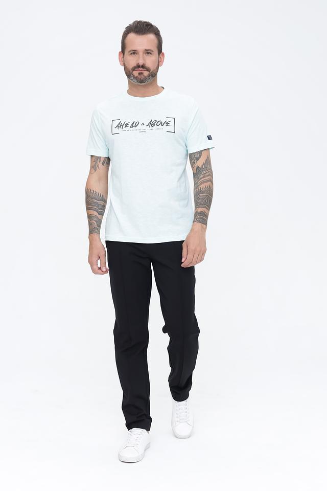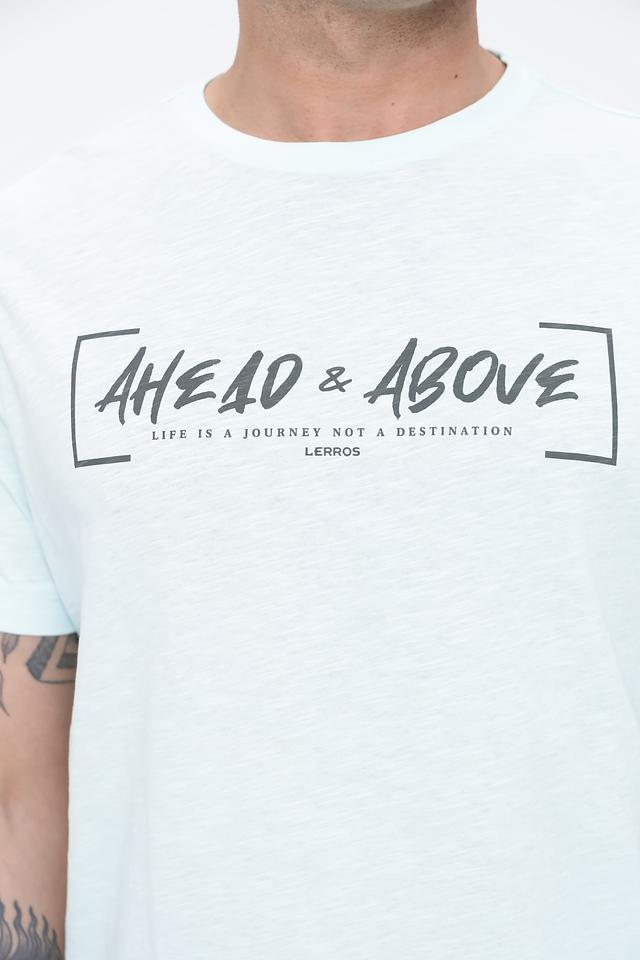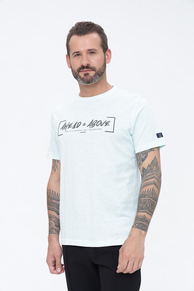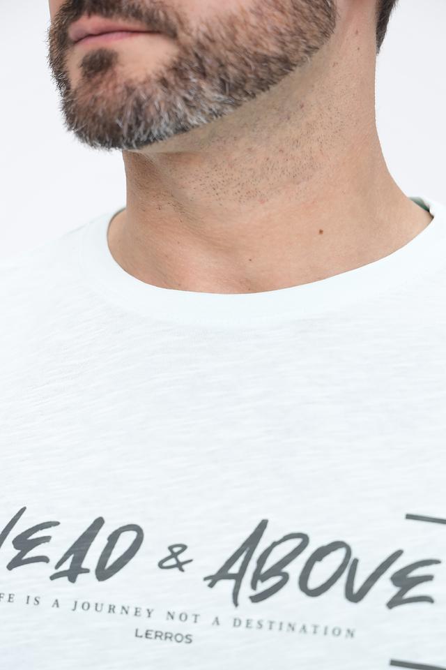 Эта стильная футболка от Lerros выполнена в нежном мятном цвете и украшена эффектным принтом "AHEAD & ABOVE", который добавляет ей индивидуальности.