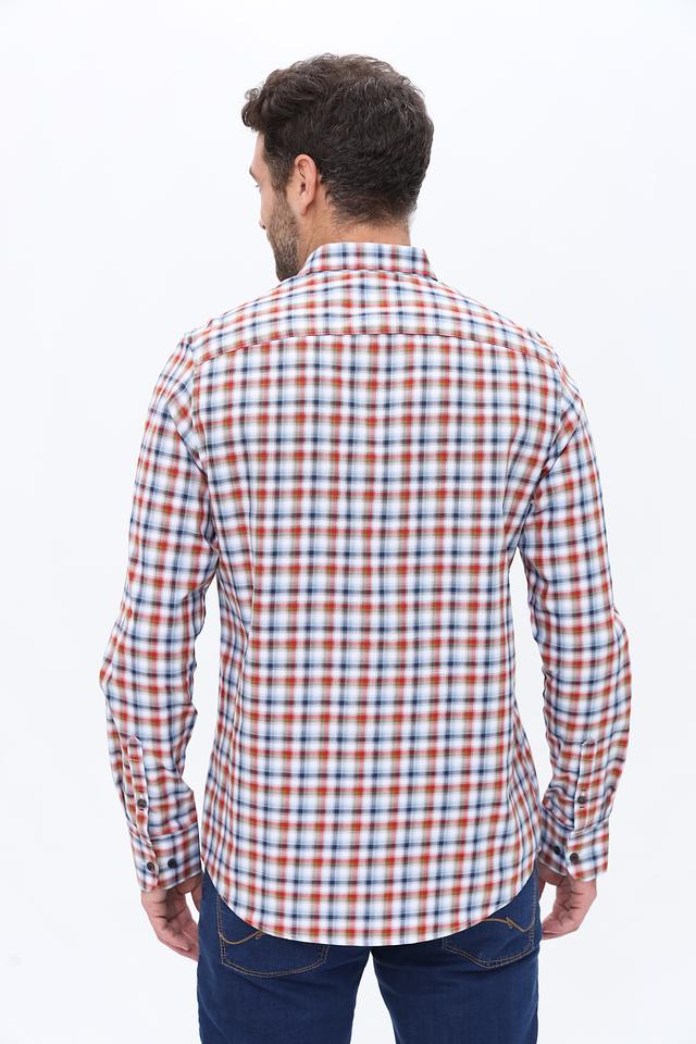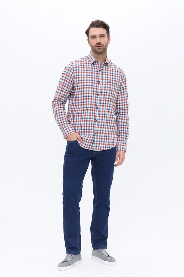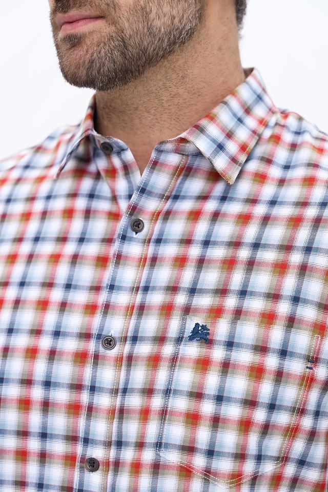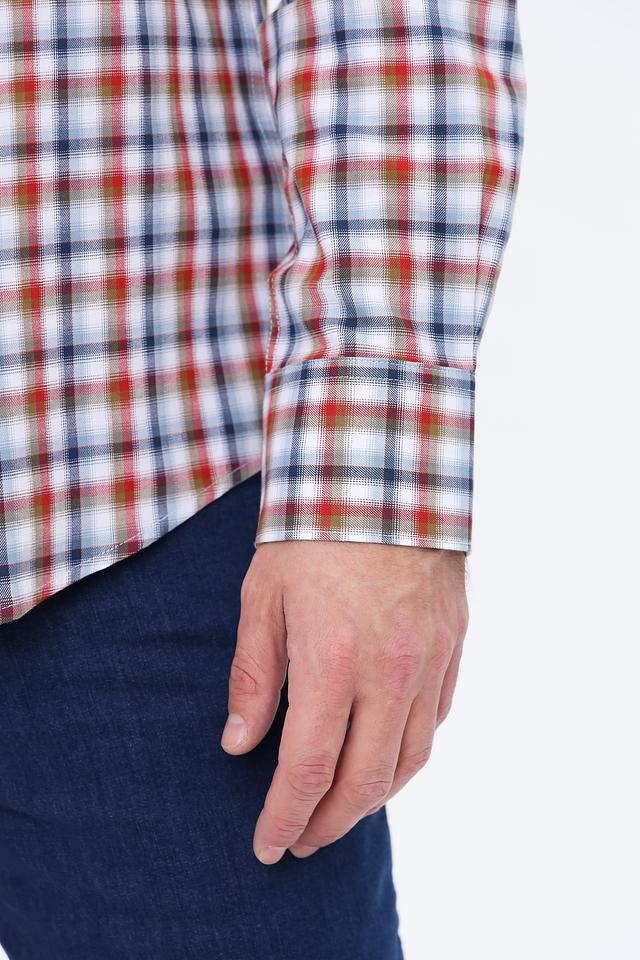 Основной цвет рубашки – белый, но её главным отличием является яркий клетчатый рисунок, сочетающий в себе оранжевые, синие и белые оттенки. Такой принт добавит динамики и индивидуальности вашему образу.