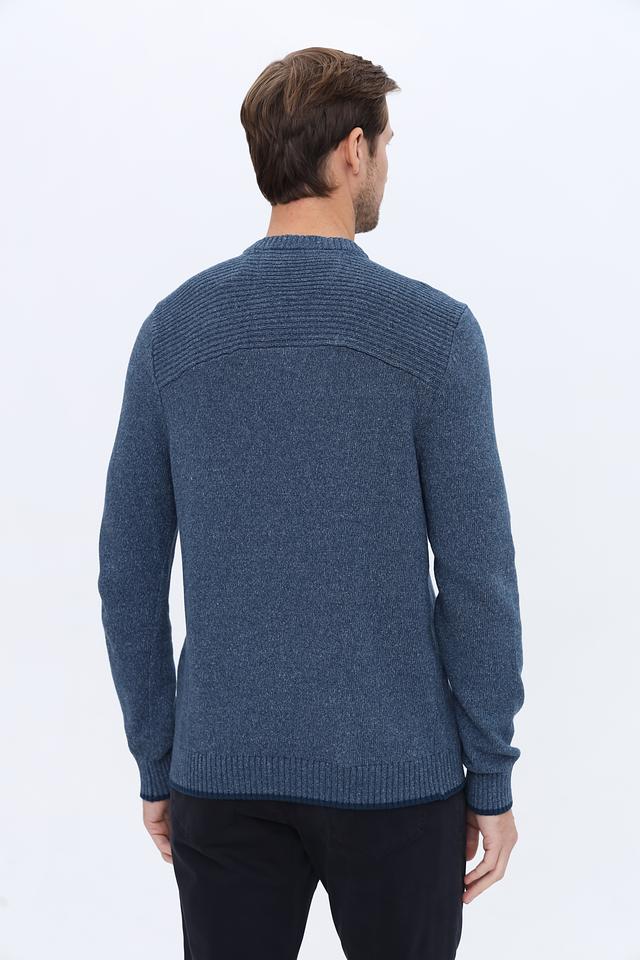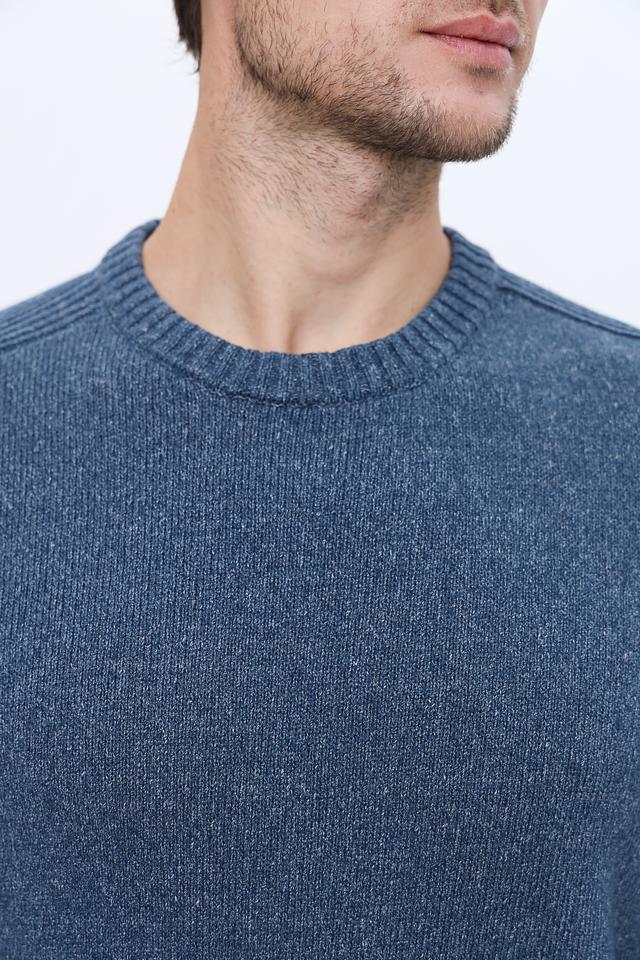 Джемпер имеет классический крой с круглым вырезом горловины и длинными рукавами. Нагрудная часть и верхняя часть спинки выполнены с текстурным плетением, что придает изделию дополнительный объем и визуальный интерес. В нижней части джемпера и на рукавах присутствует резинка, обеспечивающая плотное прилегание и комфорт.