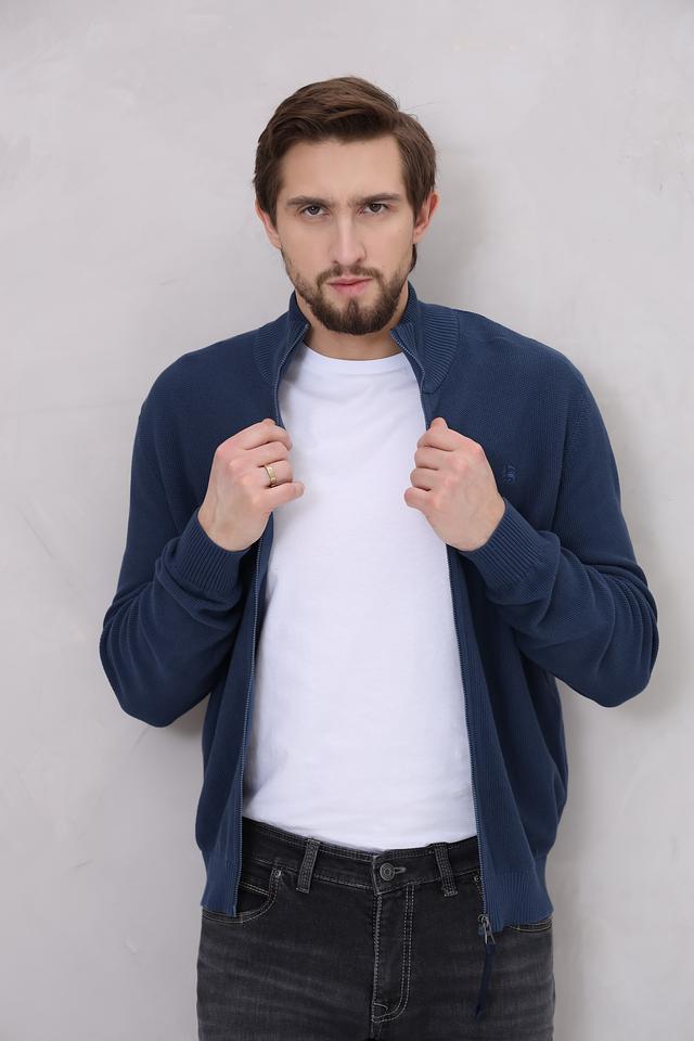 Модель имеет классический крой и застегивается на молнию. Воротник-стойка добавляет кардигану элегантности.
