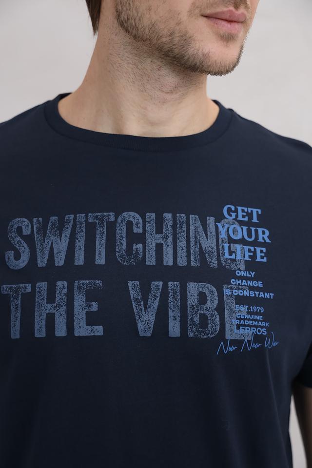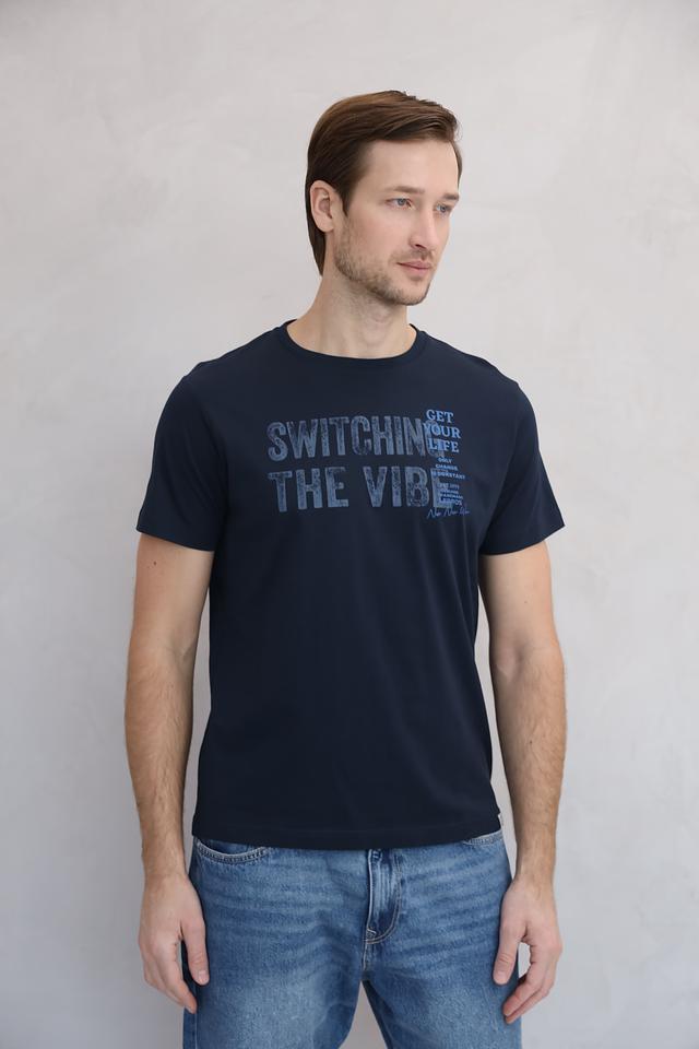Основной цвет футболки – темно-синий, который отлично сочетается с различными элементами гардероба. На лицевой стороне футболки расположен принт с надписью "SWITCHING THE VIBE", выполненный в сером цвете.