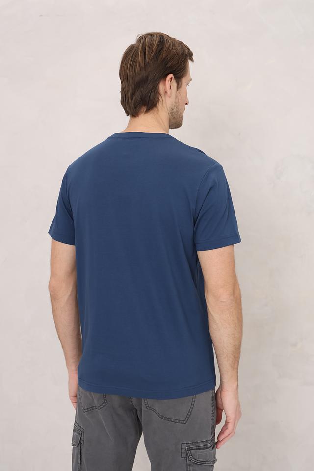 Представляем мужскую футболку от бренда Lerros. Эта футболка выполнена в насыщенном синем цвете и украшена эффектным принтом "Switching the vibe", который добавляет образу индивидуальности.