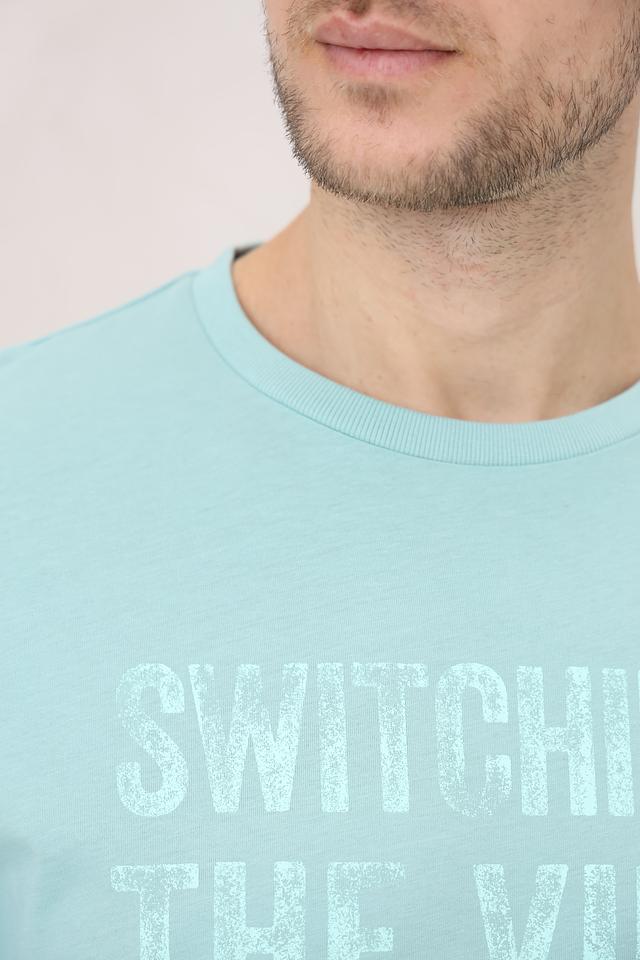 Основной цвет футболки – мятный, спокойный и освежающий оттенок. На передней части футболки расположен оригинальный белый принт с надписью "SWITCHING THE VIBE" и дополнительными графическими элементами. Принт выполнен в технике, имитирующей эффект потертости, что придает футболке стильный и современный вид.