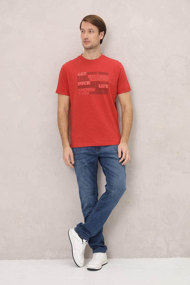 Особенностью данной модели является оригинальный принт с надписями, выполненный в контрастных тонах. Футболка имеет классический прямой крой, который обеспечивает комфортную посадку по фигуре. Круглый вырез горловины и короткие рукава делают ее идеальным выбором для теплой погоды.