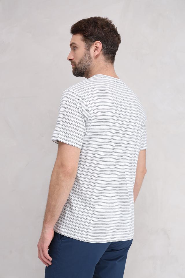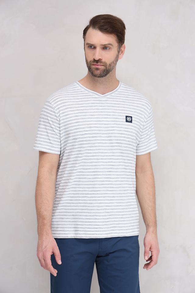 Основной цвет футболки – голубой, дополненный тонкими белыми полосками, создающими эффектный полосатый рисунок. Футболка изготовлена из высококачественного 100% хлопка, что обеспечивает максимальный комфорт при носке, позволяет коже дышать и приятна на ощупь.