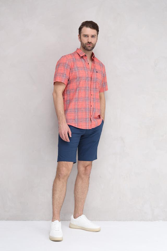 Рубашка имеет короткий рукав и прямой крой, что обеспечивает комфортную посадку по фигуре. Воротник рубашки классический, что позволяет носить ее как с галстуком, так и без.