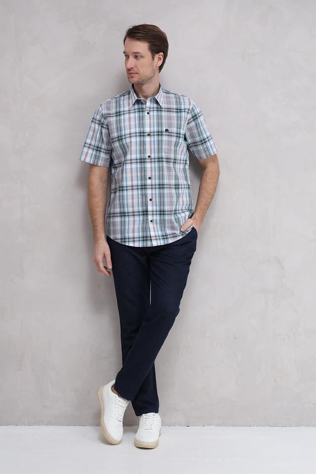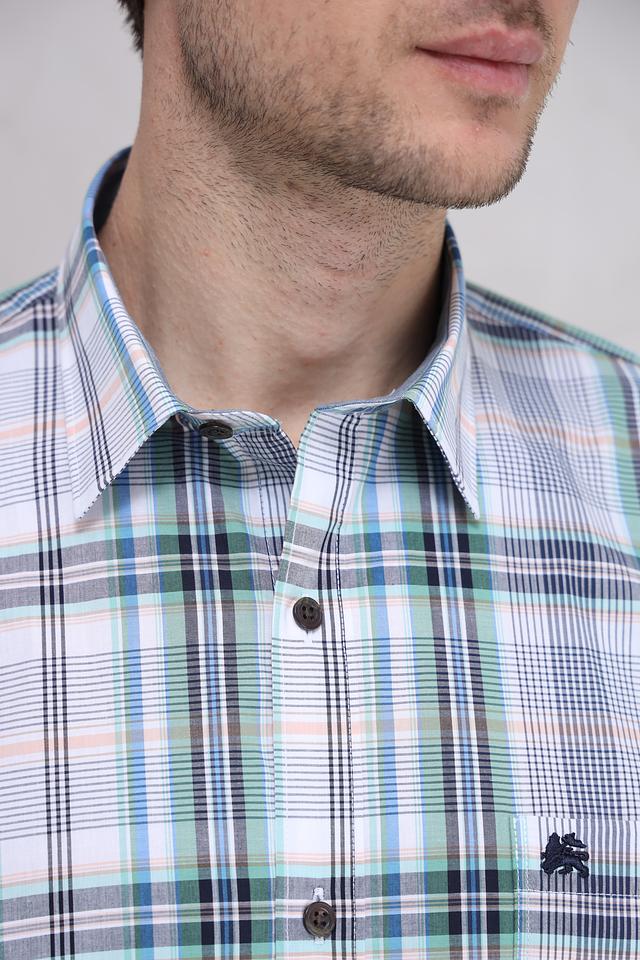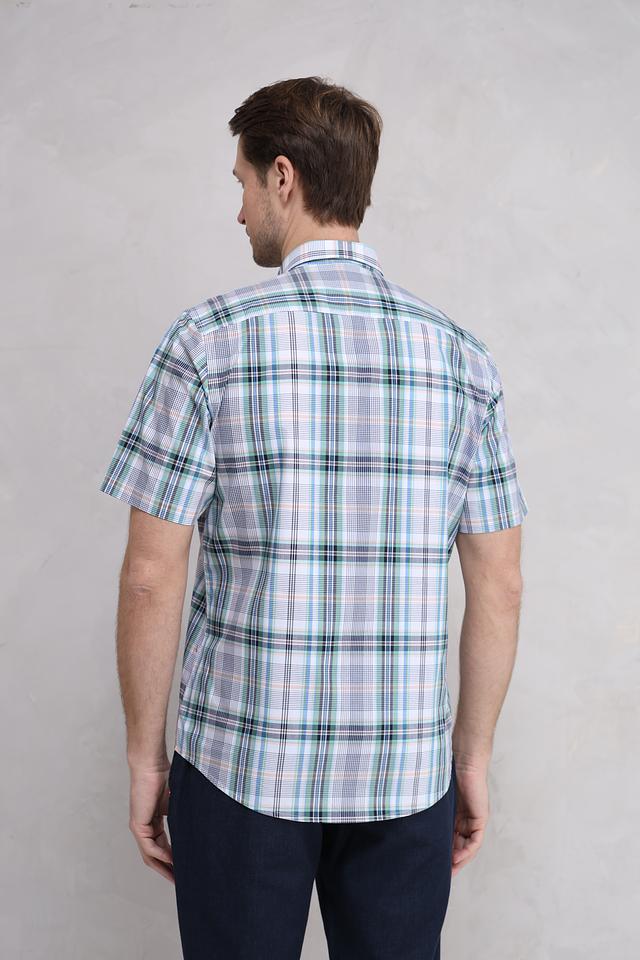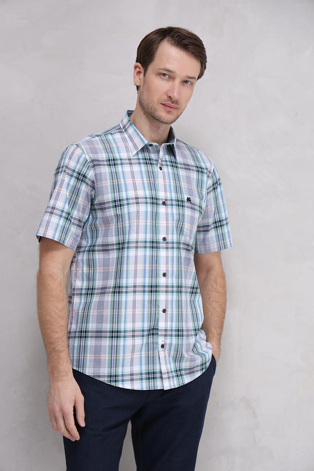 Рубашка выполнена в классическом крое с короткими рукавами и традиционным воротником. Особенностью модели является яркий клетчатый принт, сочетающий в себе оттенки голубого, зеленого, белого и серого. Небольшой логотип бренда размещен на нагрудном кармане.