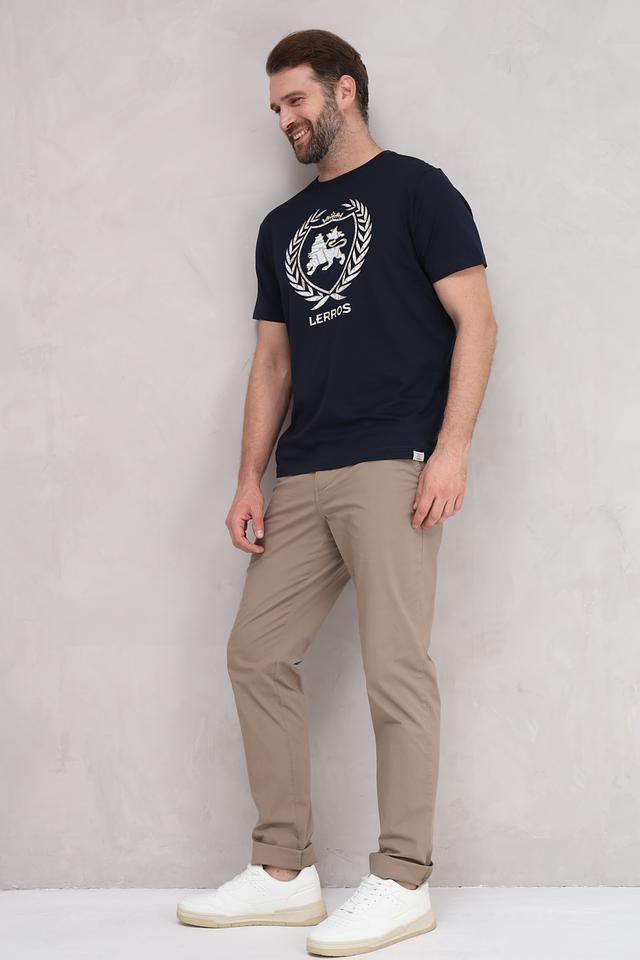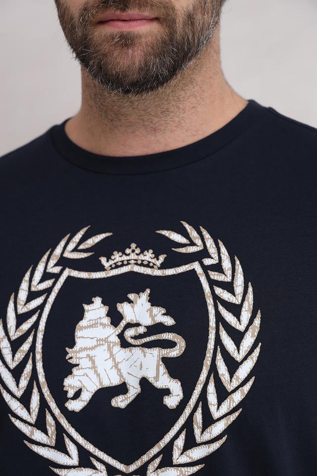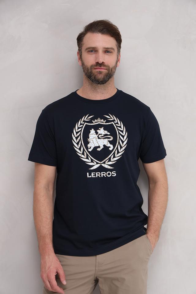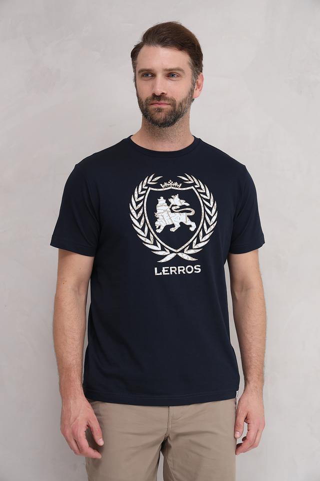 Мужская футболка Lerros тёмно-синего цвета с оригинальным принтом в виде геральдического герба. Изготовлена из 100% хлопка, обеспечивающего комфорт и воздухопроницаемость. Стильный и лаконичный дизайн. Состав: хлопок 100%