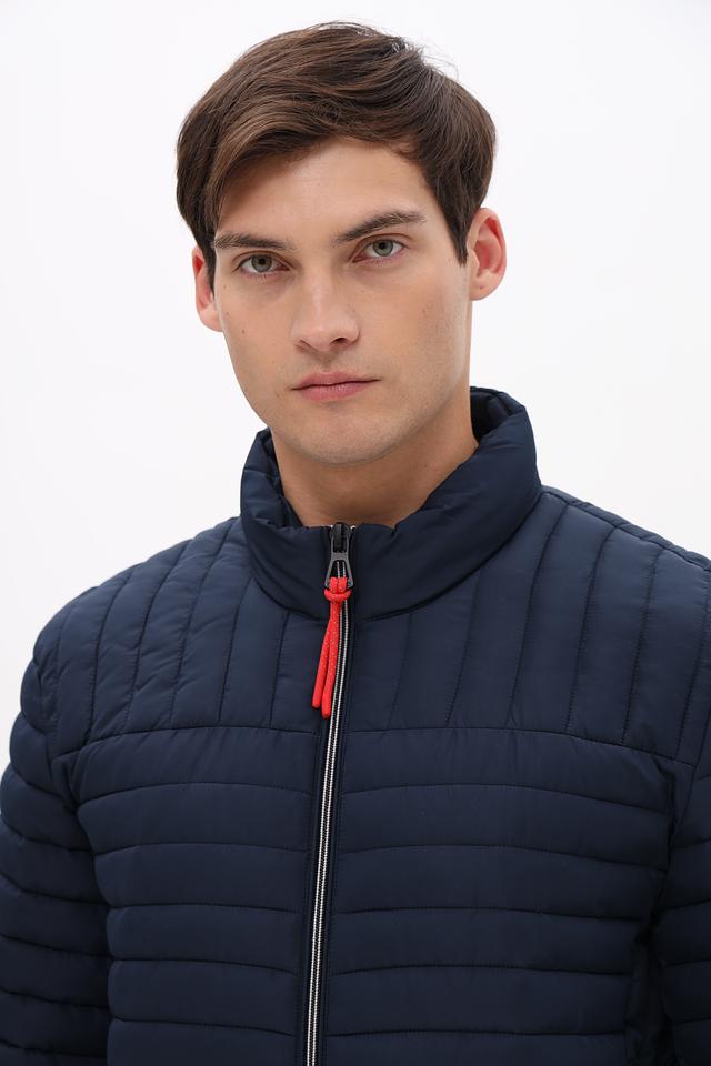 Дизайн куртки отличается стеганой текстурой, которая придает ей современный вид. Застежка-молния с красными элементами добавляет яркий акцент. Воротник-стойка обеспечивает дополнительную защиту от ветра и холода.