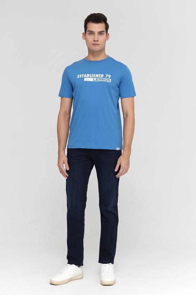 Мужская футболка Lerros выполнена в насыщенном синем цвете. Модель имеет классический крой с короткими рукавами и круглым вырезом горловины. На груди расположена яркая надпись "ESTABLISHED 79" и логотип бренда Lerros, выполненные в белом цвете.