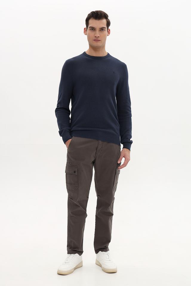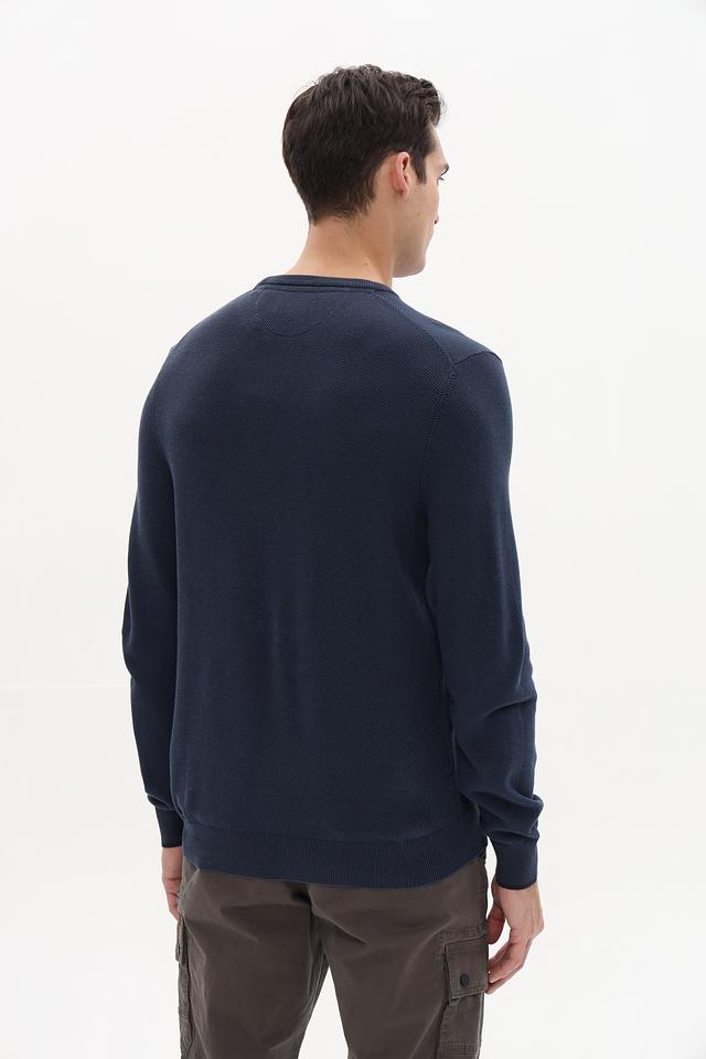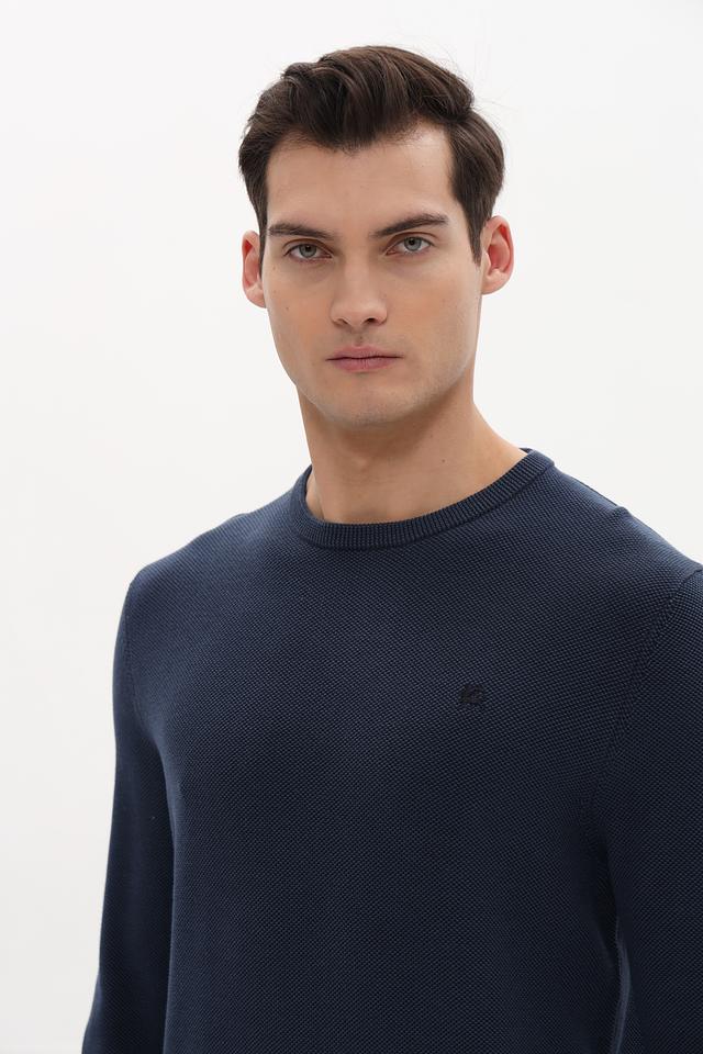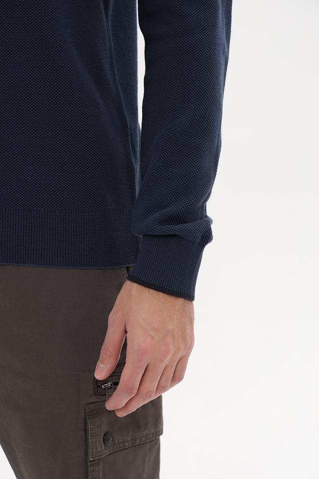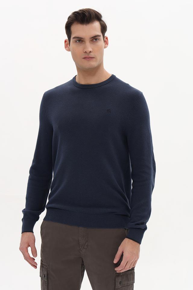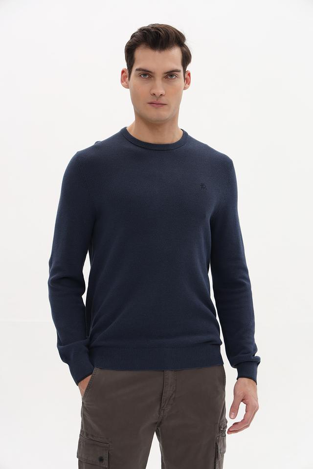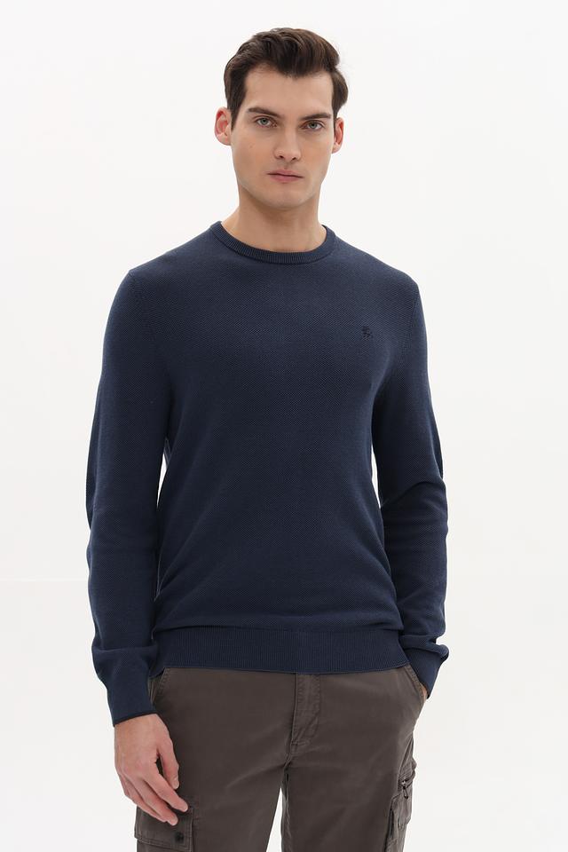 Джемпер имеет прямой крой, круглый вырез горловины и длинные рукава. Изготовлен из высококачественного хлопка, что обеспечивает комфорт и воздухопроницаемость. Тёмно-синий цвет делает его универсальным и легко сочетаемым с другими элементами одежды.